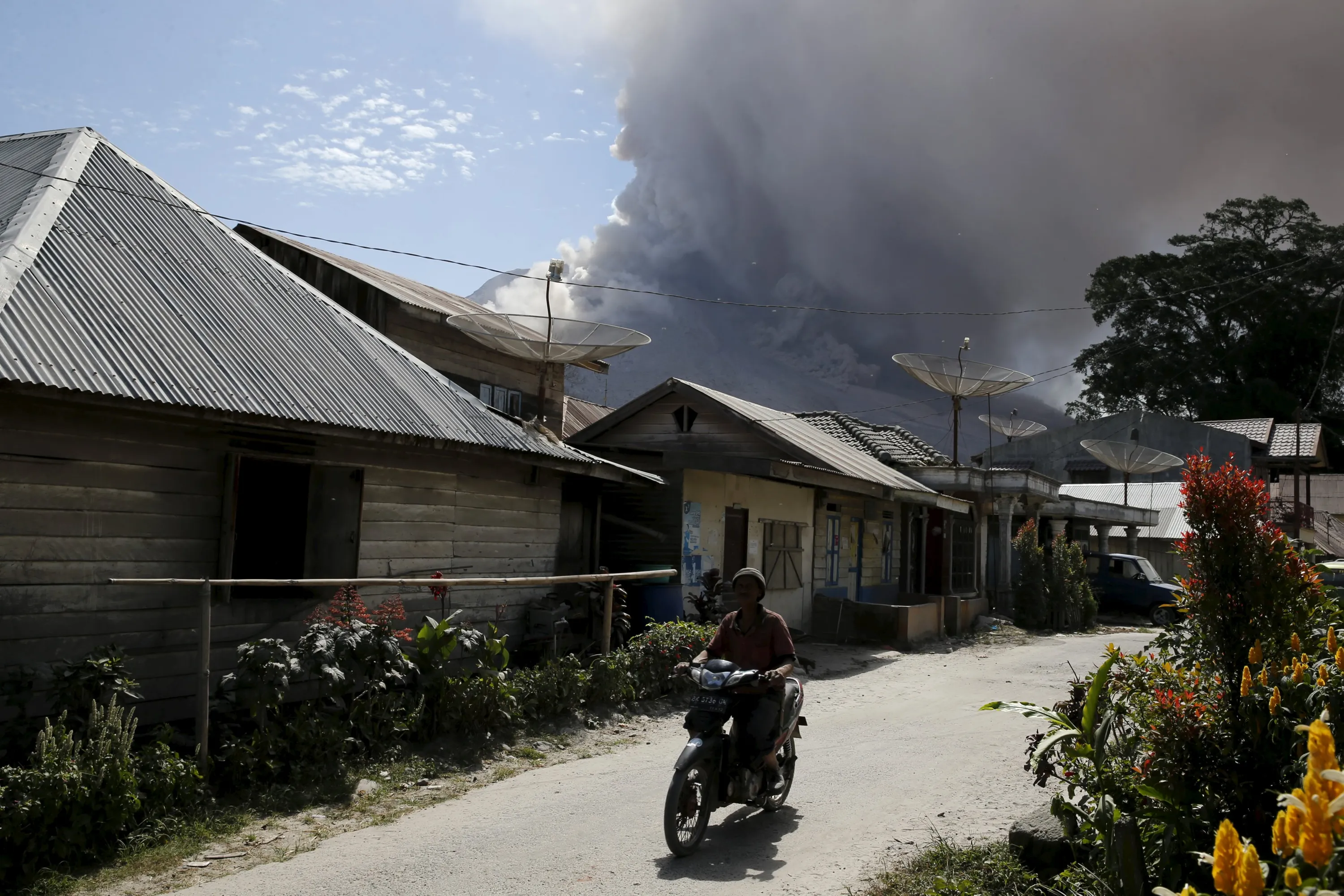 A resident rides a motorcycle as ash spews from Mount Sinabung volcano during eruption at Gamber village in Karo Regency, North Sumatra province, Indonesia June 29, 2015. (Photo by Reuters/Beawiharta)