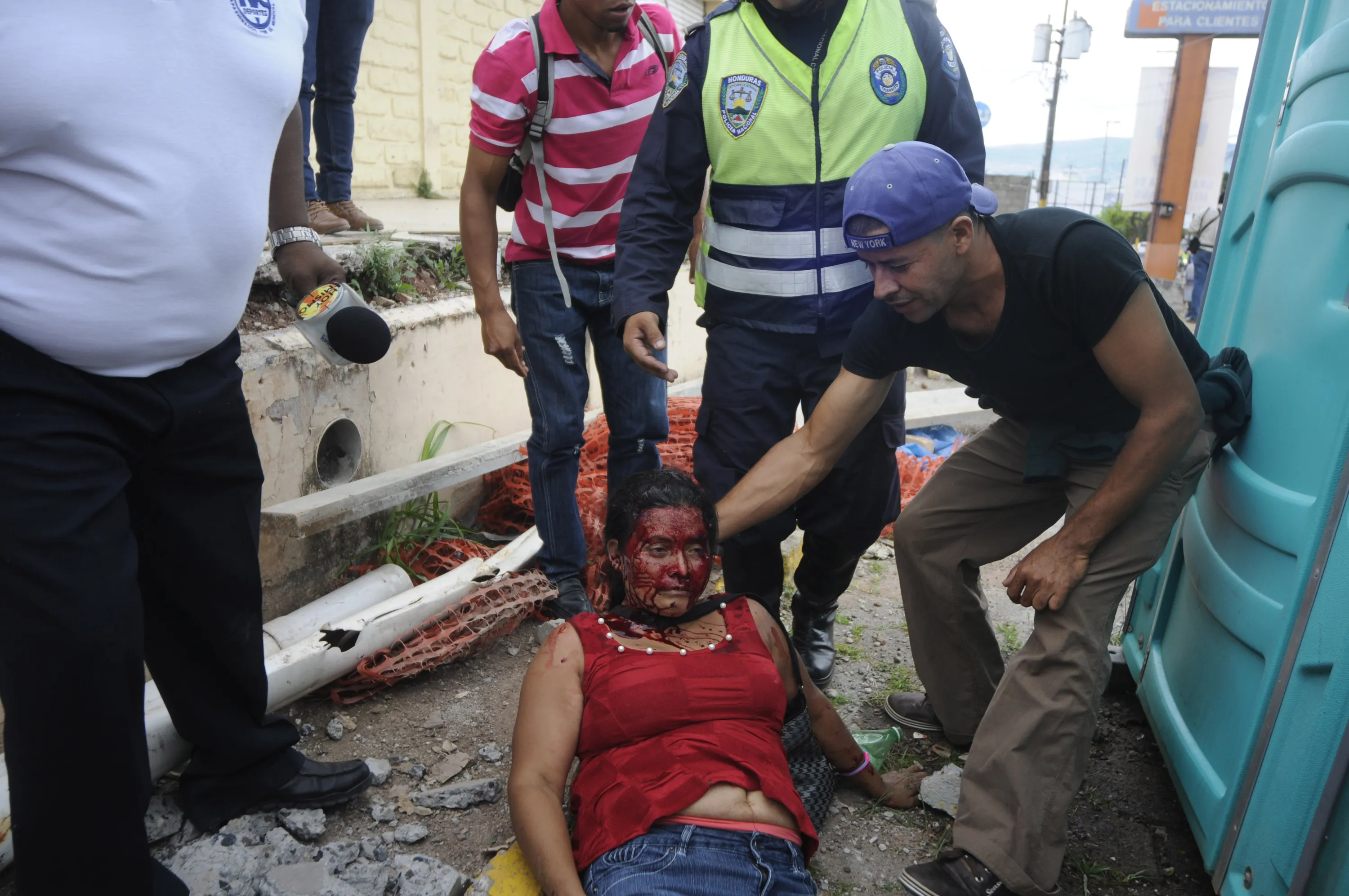 A woman is helped after she was injured when a march belonging to the National Front for Popular Resistance (FNRP) that was protesting against recent government corruption scandals and also to mark the 6th anniversary of the 2008 military overthrow of President Juan Manuel Zelaya, clashed with another march that was supporting the current President Juan Orlando Hernandez in Tegucigalpa, Honduras, Sunday, June 28, 2015. the current government has been under pressure over a corruption scandal that involved the alleged embezzlement of as much as $120 million from the Central American country's Social Security Institute. (Photo by Fernando Antonio/AP Photo)