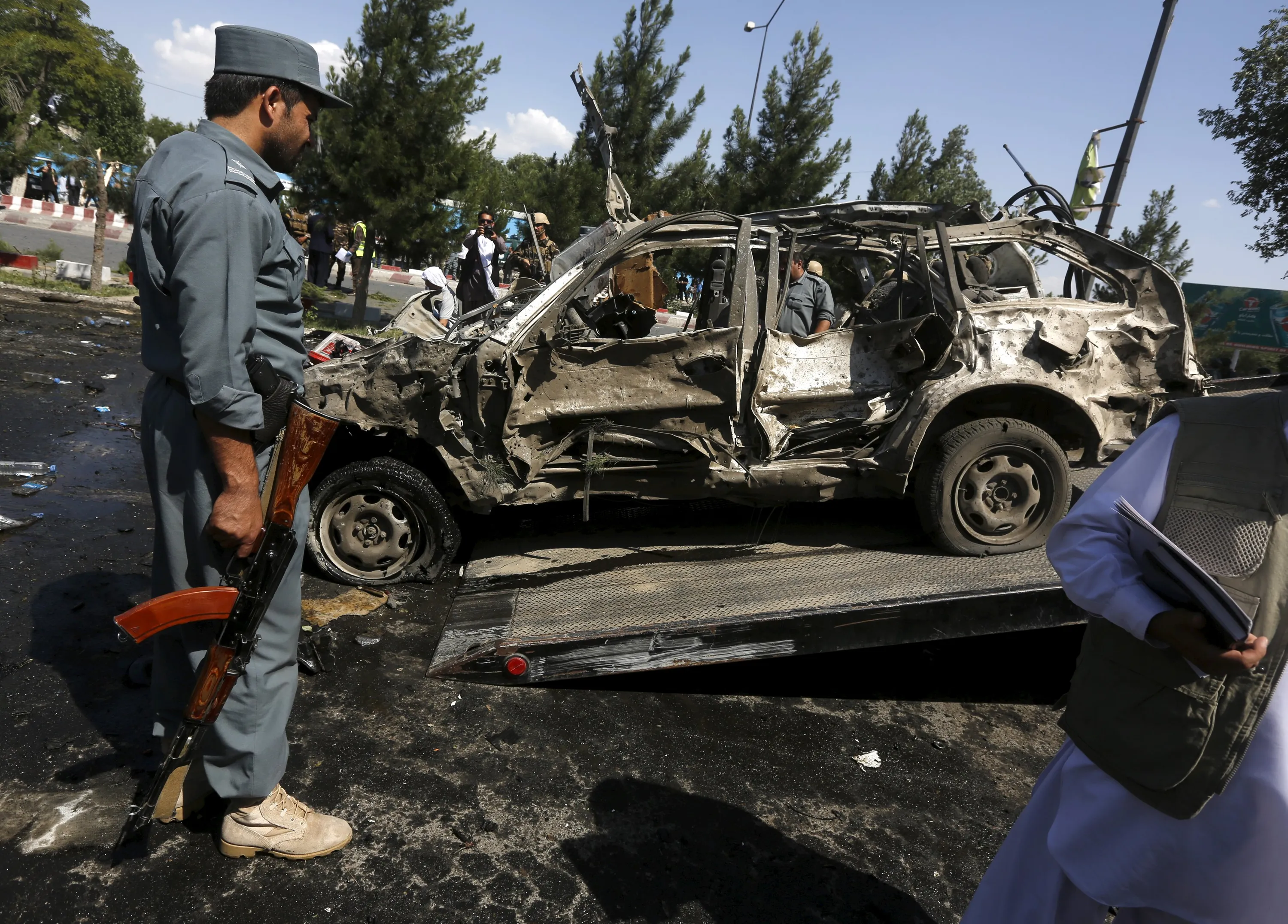 An Afghan policeman inspects the site of a suicide bomb attack in Kabul, Afghanistan, June 30, 2015. (Photo by Omar Sobhani/Reuters)