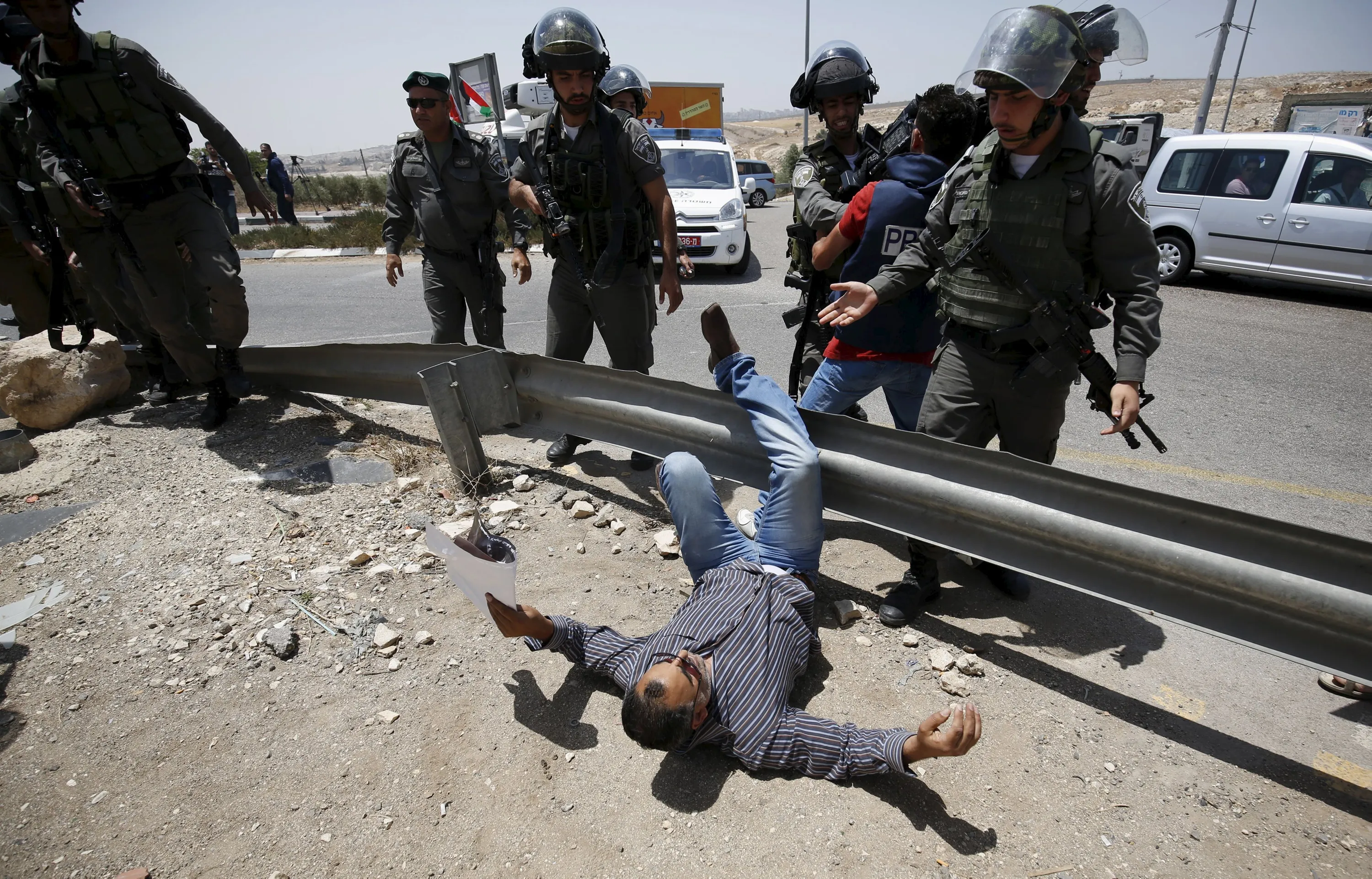A Palestinian protester falls on the ground after being pushed by Israeli border policemen during a protest marking the first anniversary of the killing of 16-year-old Palestinian Mohammed Abu Khudair, who was burnt in Jerusalem in a suspected revenge attack for the kidnapping and slaying of three Israeli teens last year, near the West Bank city of Ramallah July 2, 2015. (Photo by Mohamad Torokman/Reuters)