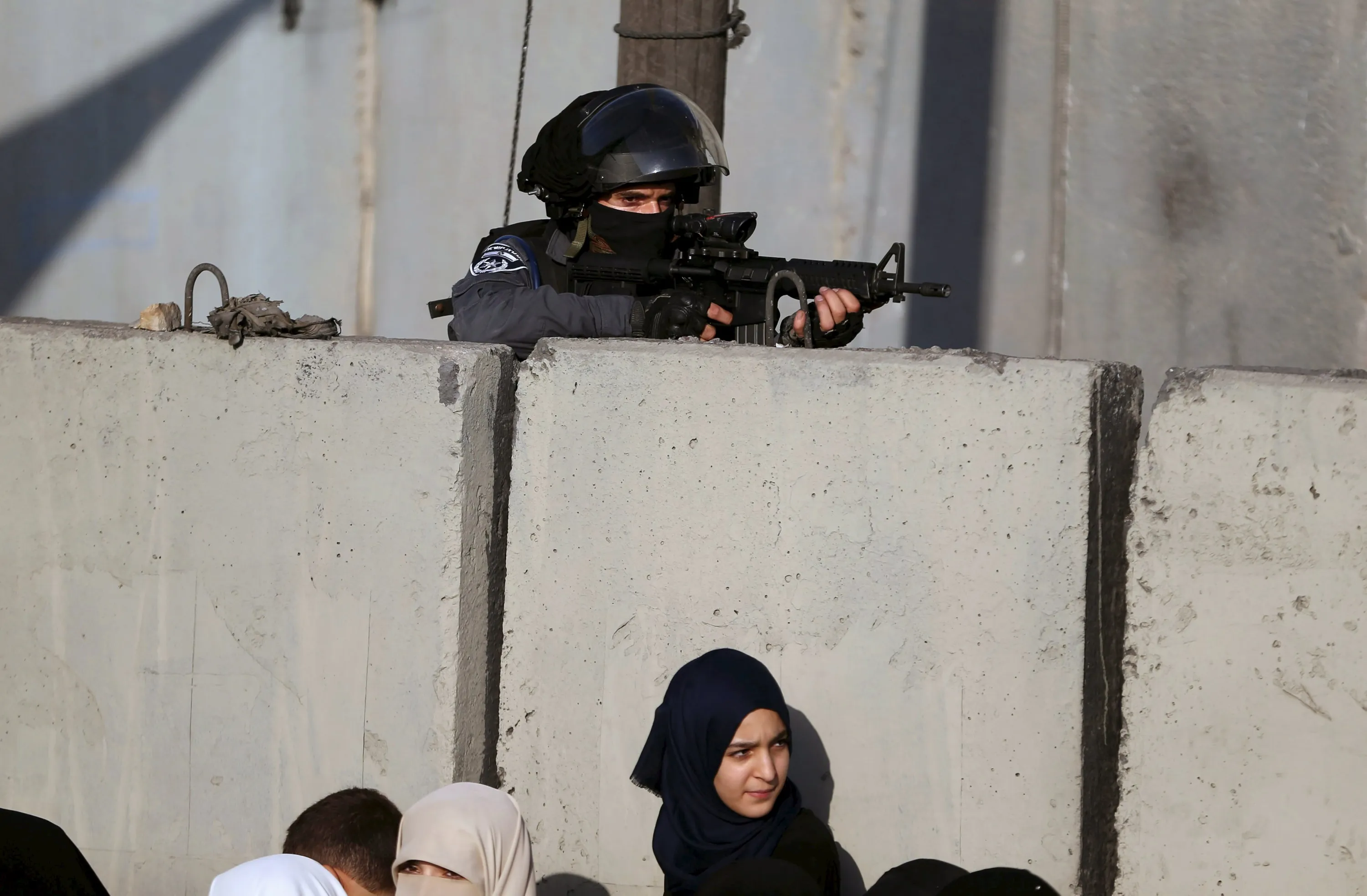 An Israeli border policeman keeps guard as a Palestinian girl waits with her mother to show their permits to Israeli security officers to make their way to attend the third Friday prayer of Ramadan in Jerusalem's al-Aqsa mosque, at Qalandia checkpoint near the West Bank city of Ramallah, July 3, 2015. (Photo by Mohamad Torokman/Reuters)