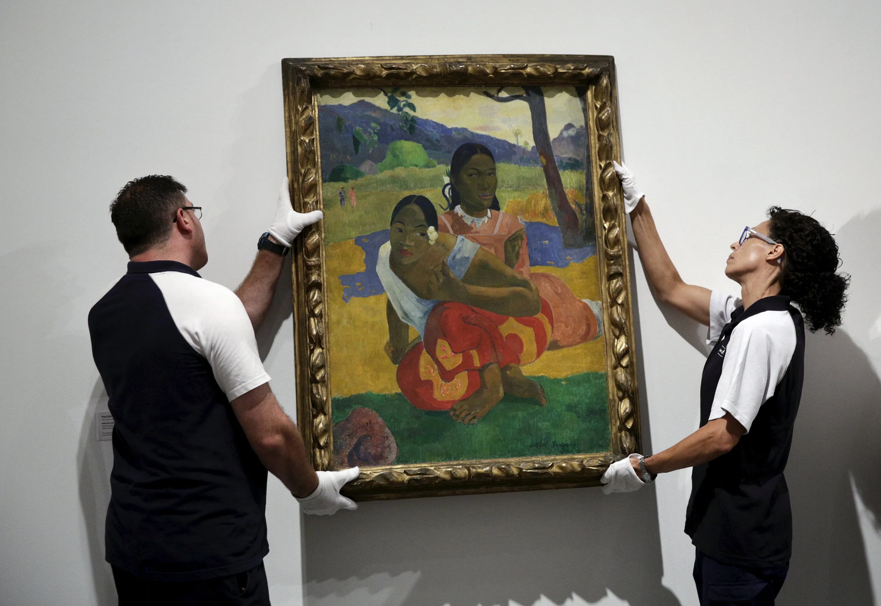 Museum workers hang Paul Gaugin's “Nafea faa ipoipo” (When will you marry) on a wall at the Reina Sofia museum in Madrid, Spain, July 3, 2015. The painting, believed to be the world's most expensive painting, is on show at Madrid's Reina Sofia among other paintings coming from the Basel museum, according to media and museum sources. (Photo by Andrea Comas/Reuters)