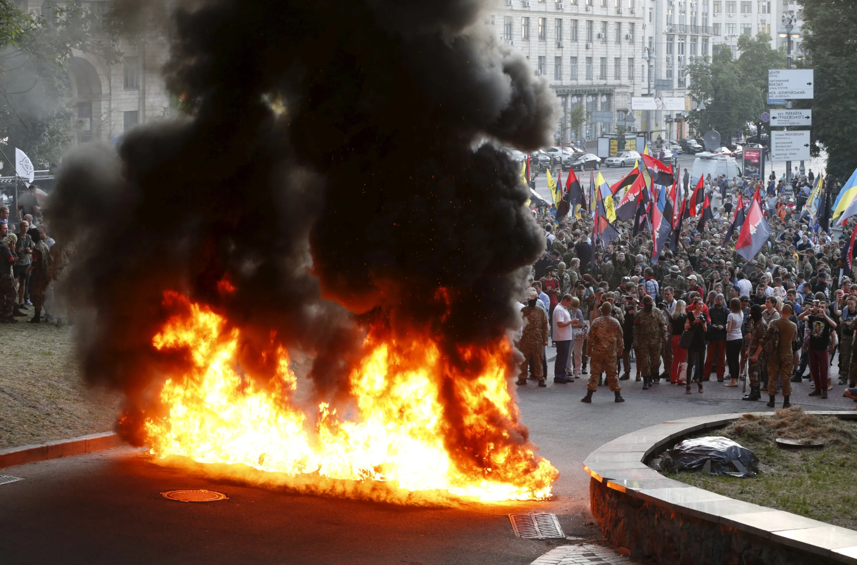 Tyres are set on fire during a rally held by members of the far-right radical group Right Sector, representatives of the Ukrainian volunteer corps and their supporters in central Kiev, Ukraine, July 3, 201. (Photo by Valentyn Ogirenko/Reuters)