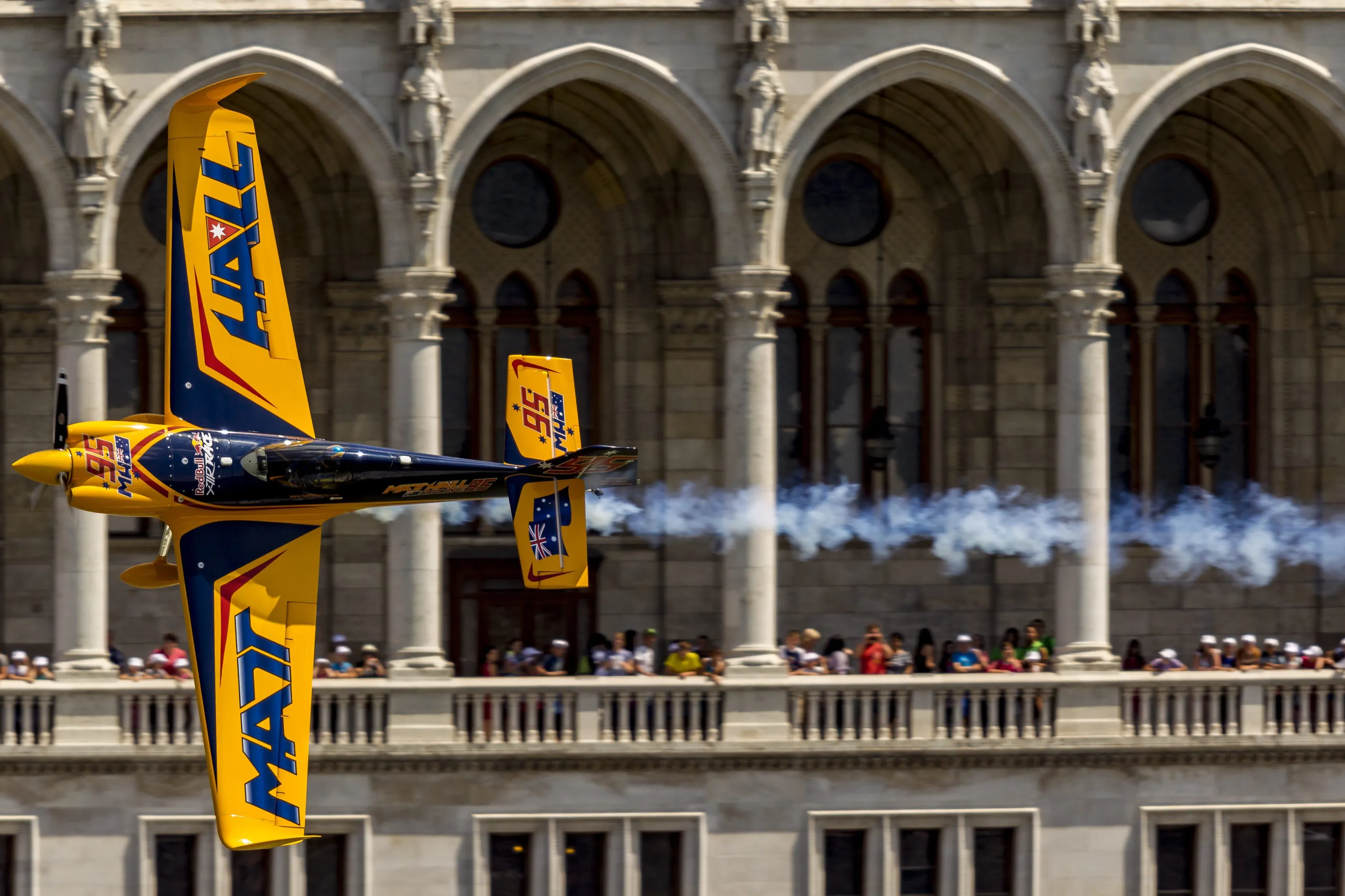 Australian pilot Matt Hall flies above the River Danube during the Masters free practice session of the Red Bull Air Race World Series Budapest stage in central Budapest, Hungary, July 3, 2015. The race is to be held on July 5. (Photo by Zsolt Szigetvary/EPA)