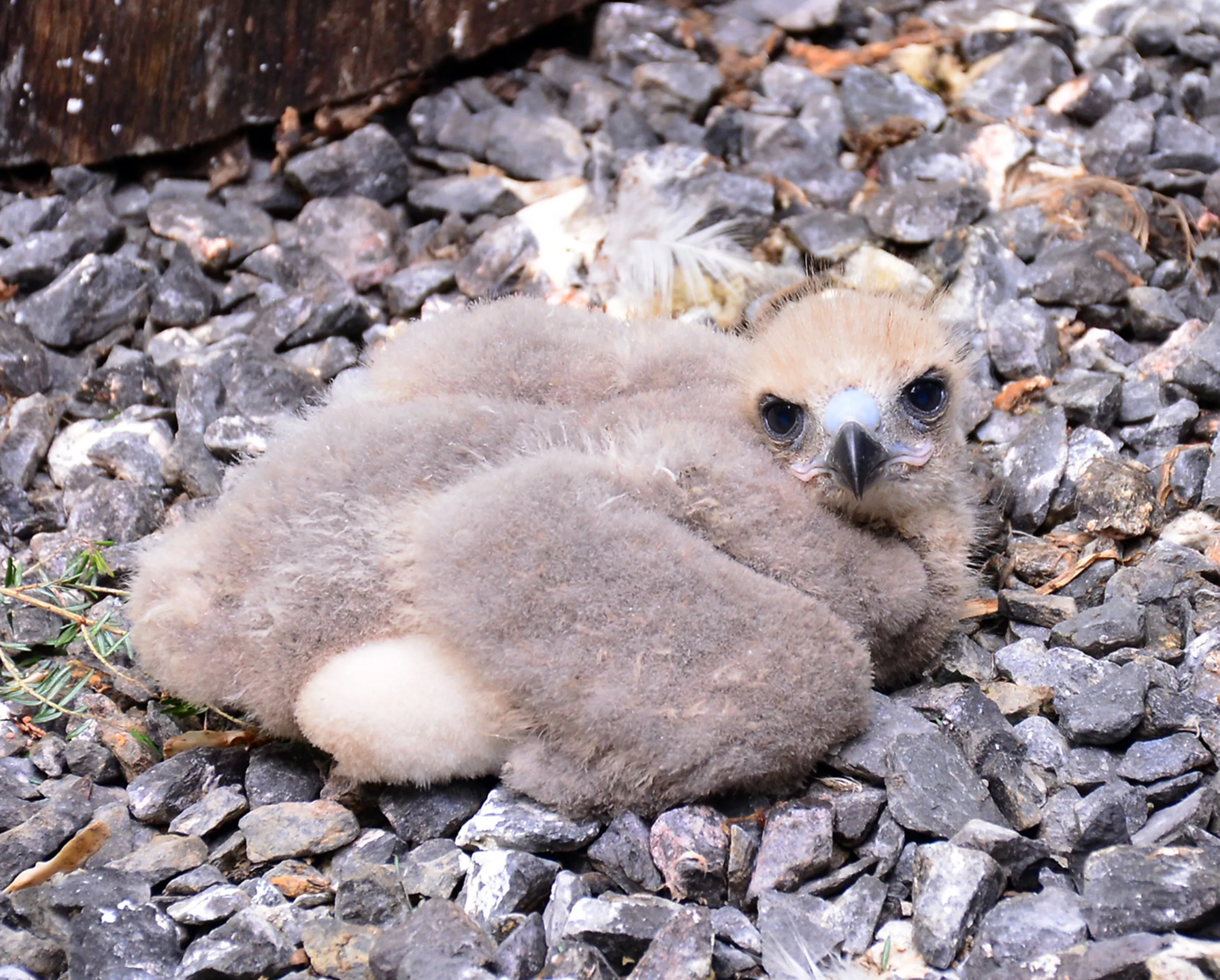 In this June 26, 2015 photo, a baby red-tailed hawk watches the door of its enclosure at the West Virginia Raptor Rehabilitation Center near Fairmont, W.Va. (Photo by Tammy Shriver/Times-West Virginian via AP Photo)
