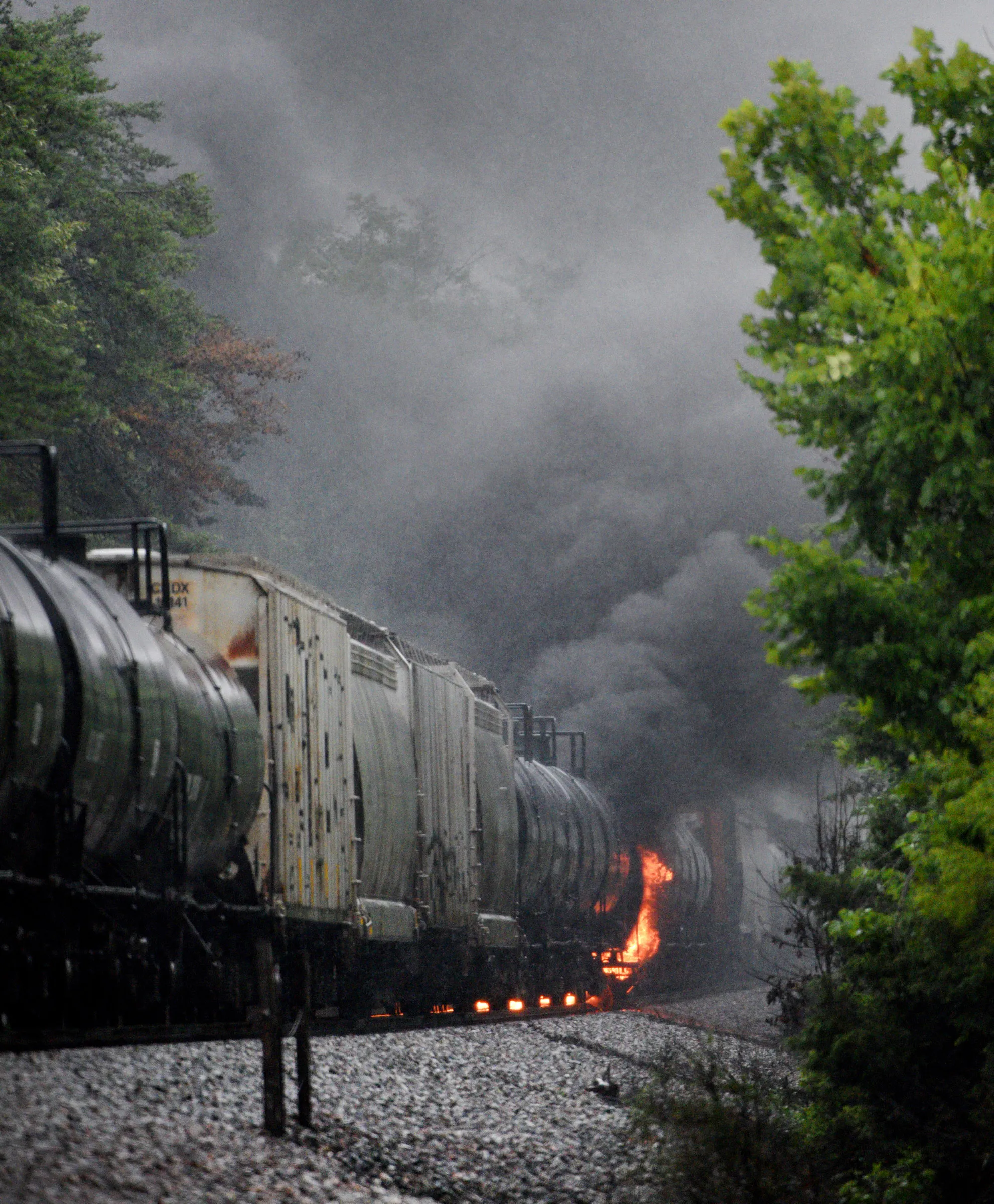 Smoke rises from a CSX train following the derailment of a train car, Thursday, July 2, 2015, in Maryville, Tenn. The derailment of the car, carrying a flammable and toxic substance, caused the evacuation of thousands in the surrounding area. (Photo by Michael Patrick/Knoxville News Sentinel via AP Photo)