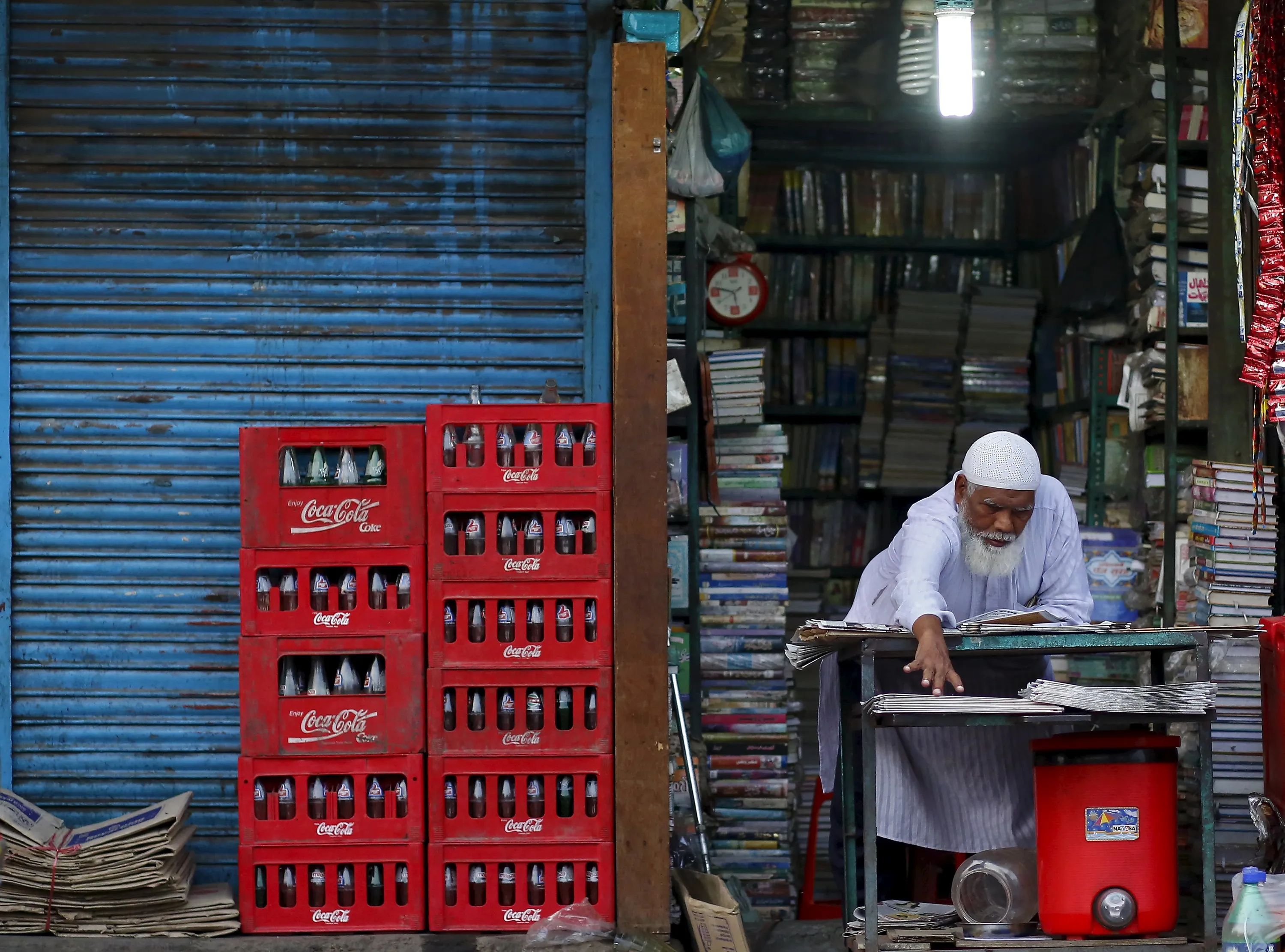 A shopkeeper extends his hand as he arranges newspapers for sale at his shop during early morning in the old quarters of Delhi, India, July 2, 2015. (Photo by Anindito Mukherjee/Reuters)