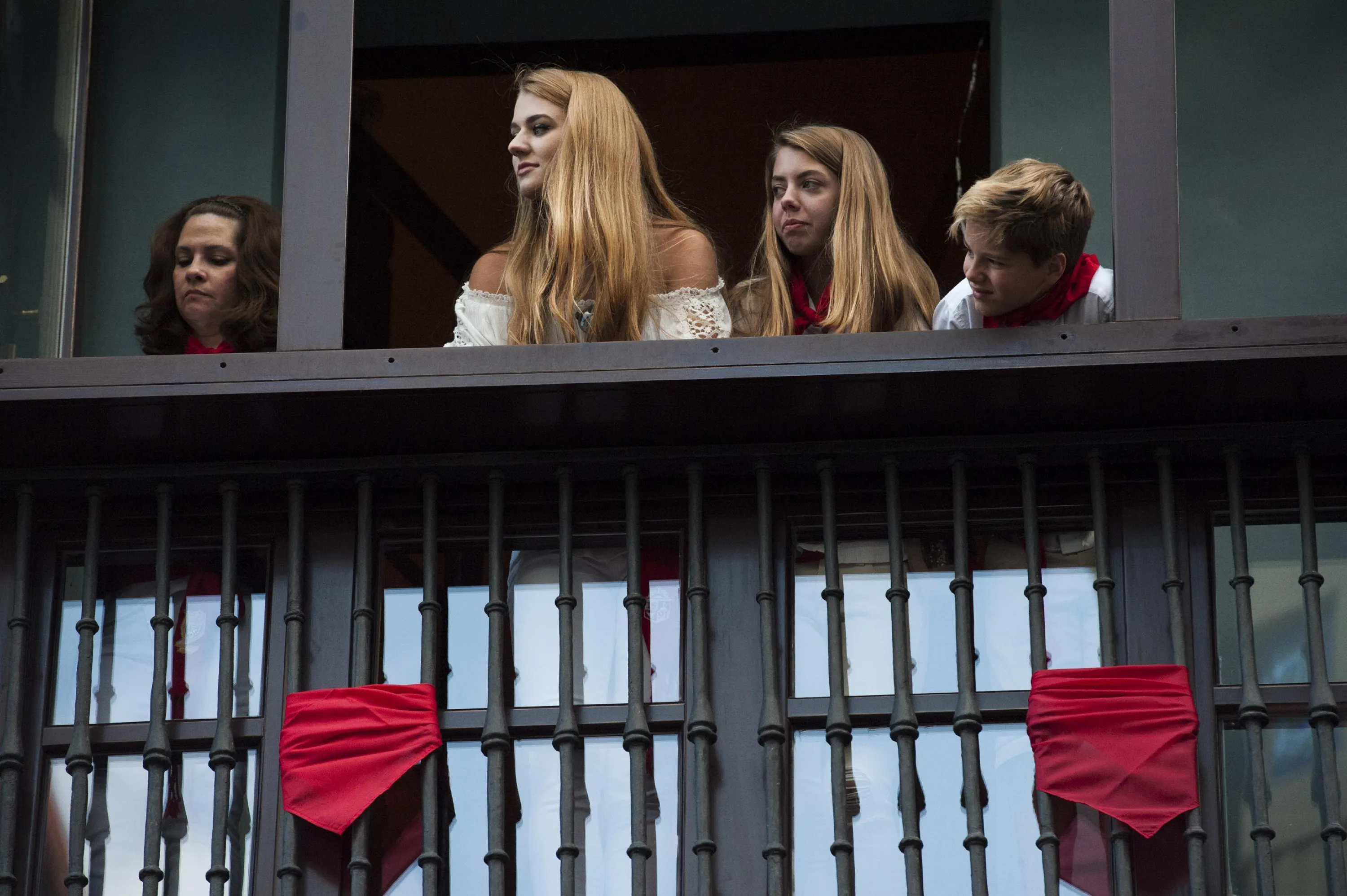 People watch from a balcony decorated with a red kerchief at the beginning of the third running of the bulls, at the San Fermin Festival, in Pamplona, Spain, Thursday, July 9, 2015. (Photo by Alvaro Barrientos/AP Photo)