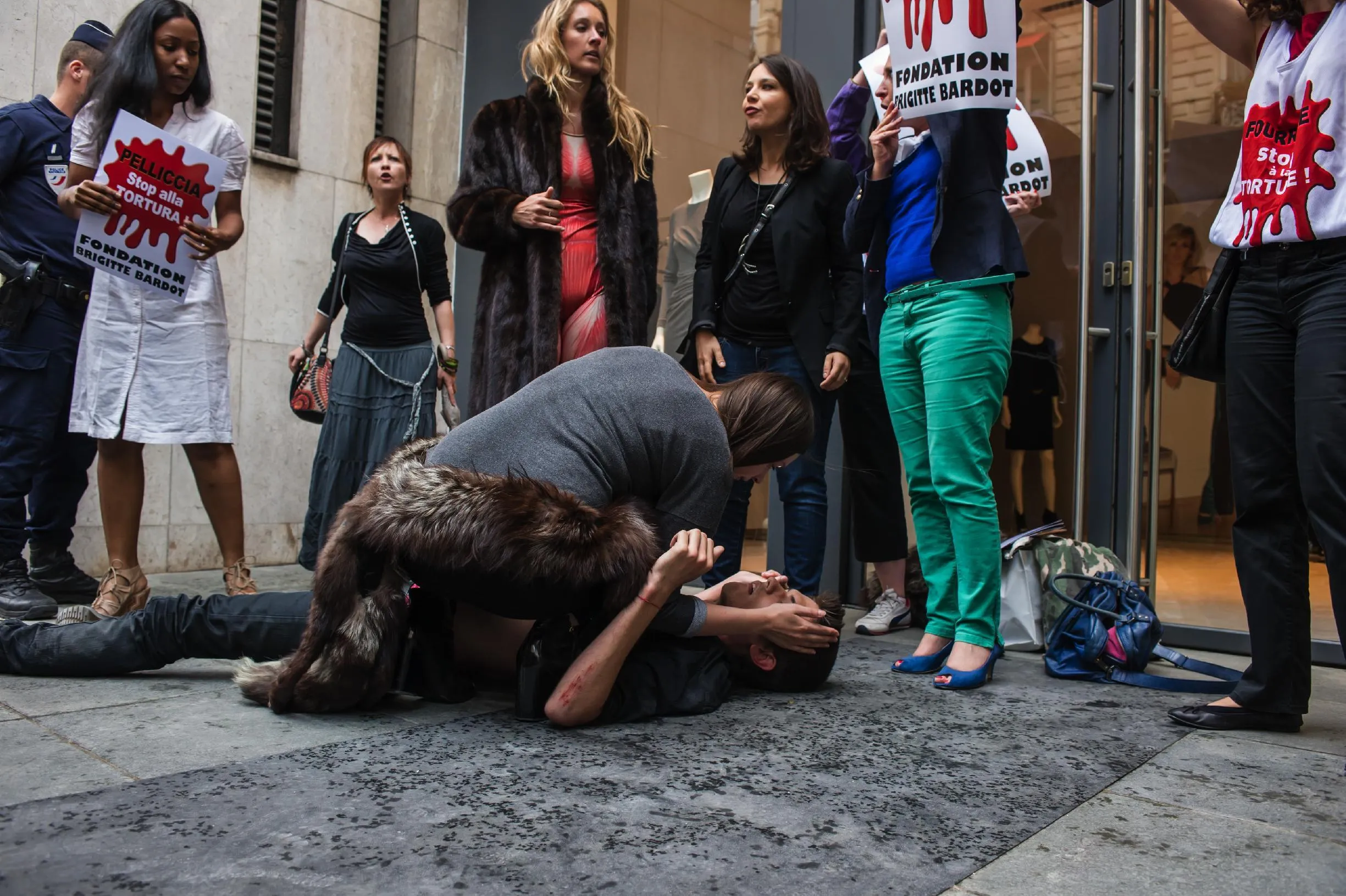 A demonstrator is helped by another activist after he fainted during a clash with the police in Paris, France, Wednesday, July 8, 2015. Animal rights activists staged a protest against designer Karl Lagerfeld's fur-only couture show for Fendi on Wednesday. The animal-rights Brigitte Bardot Foundation claimed responsibility for disruption – when an unnamed woman, dressed in a fur coat, ripped it off outside the venue to reveal beneath a shocking bloodied body suit, with breasts visible. Other animal rights activists tried to storm the gate unsuccessfully. (Photo by Kamil Zihnioglu/AP Photo)