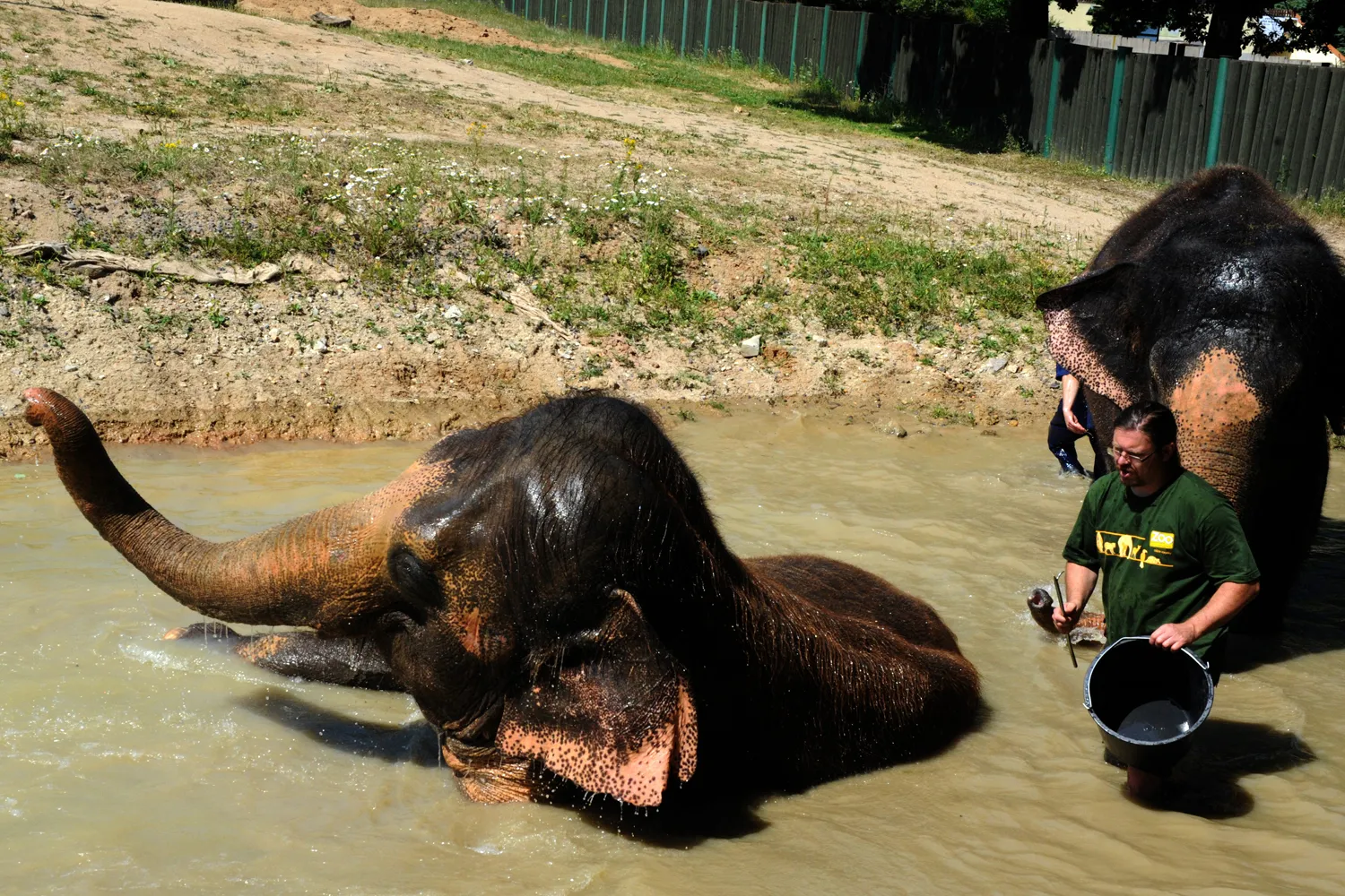 Keepers Petr Kiebel (left) and Pavel Kokert assist to cool elephants Kale and Delhi in the pool, in Usti nad Labem Zoo, Czech Republic, July 7, 2015. (Photo by Libor Zavoral/CTK/ZUMAPress)