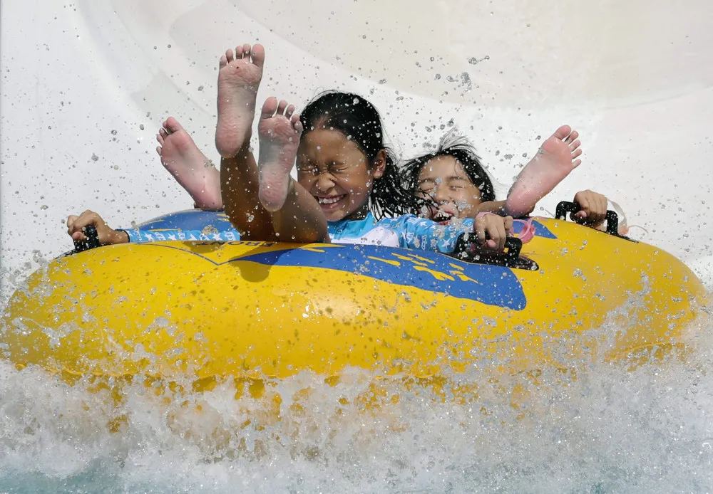 Two girls come down a water slide in a rubber ring at Toshimaen pool in Tokyo, Japan, 12 July 2015. About 10,000 people visited the pool while temperatures rose to 33.6 degrees Celcius. Authorities have issued a warning in many areas. The highest temperature was registered at 36.6 degrees Celcius in Tatebayashi, north of Tokyo. (Photo by Kimimasa Mayama/EPA)