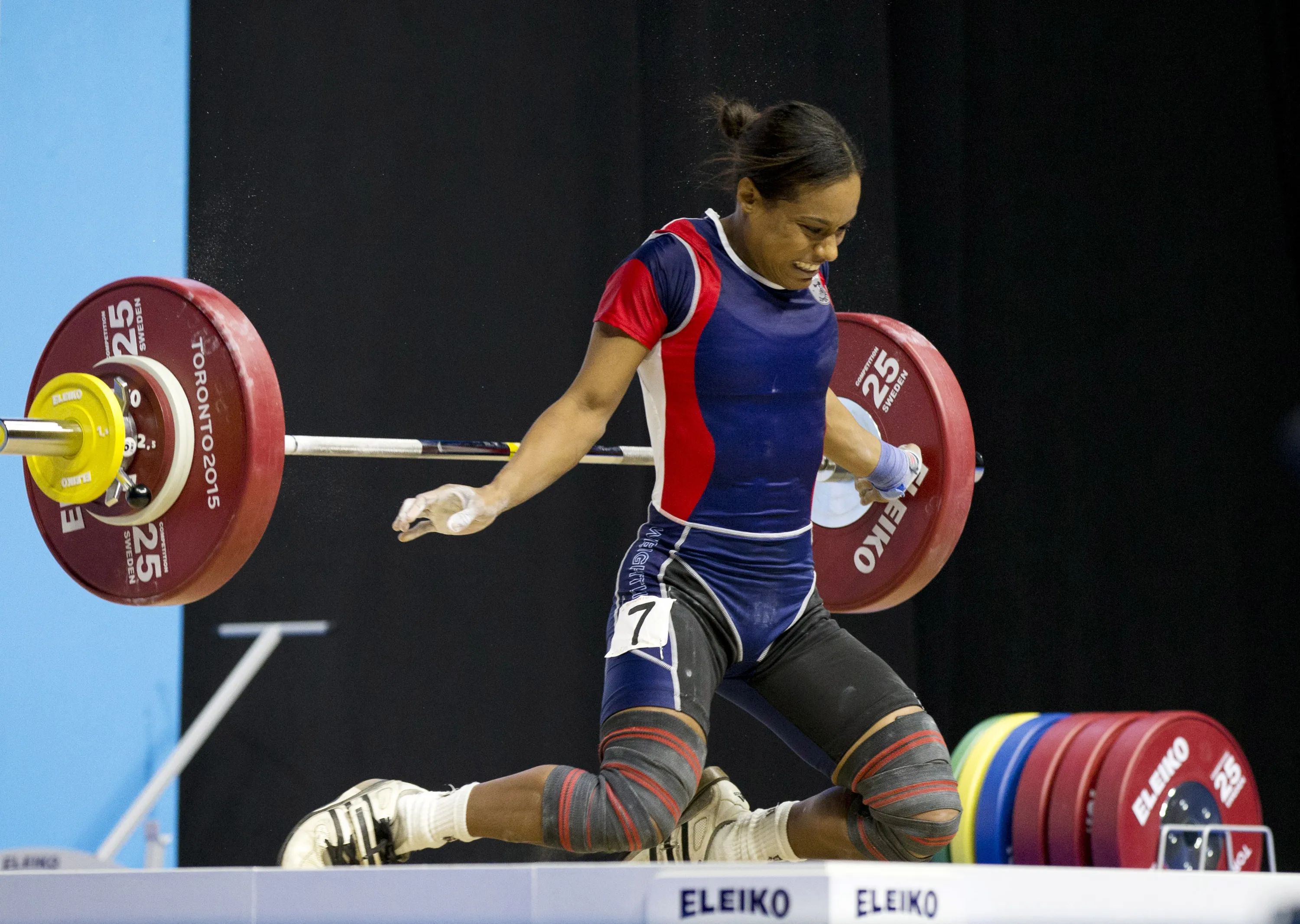 Pan Am record holder Yuderquis Contreras falls to her knees during a failed snatch attempt in the women's 53kg weightlifting event at the Pan Am Games in Oshawa, Ontario, Sunday, July 12, 2015. (Photo by Rebecca Blackwell/AP Photo)