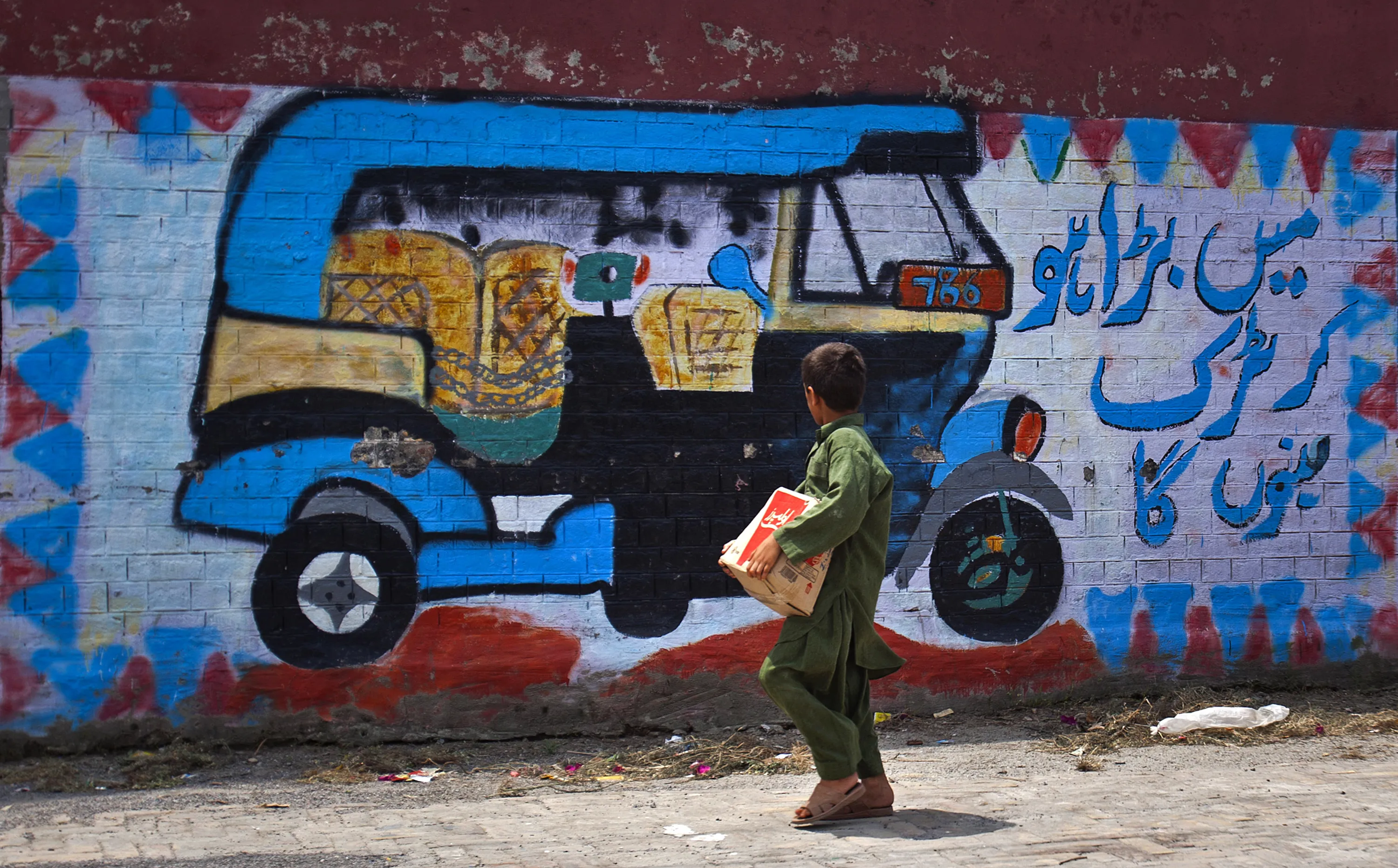 A Pakistani boy looks a mural of a three-wheeled tuk-tuk that is painted on the wall of a school in Rawalpindi, Pakistan, Monday, July 6, 2015. Writing in Urdu reads, “when I grow up, I will become a truck”. (Photo by Anjum Naveed/AP Photo)