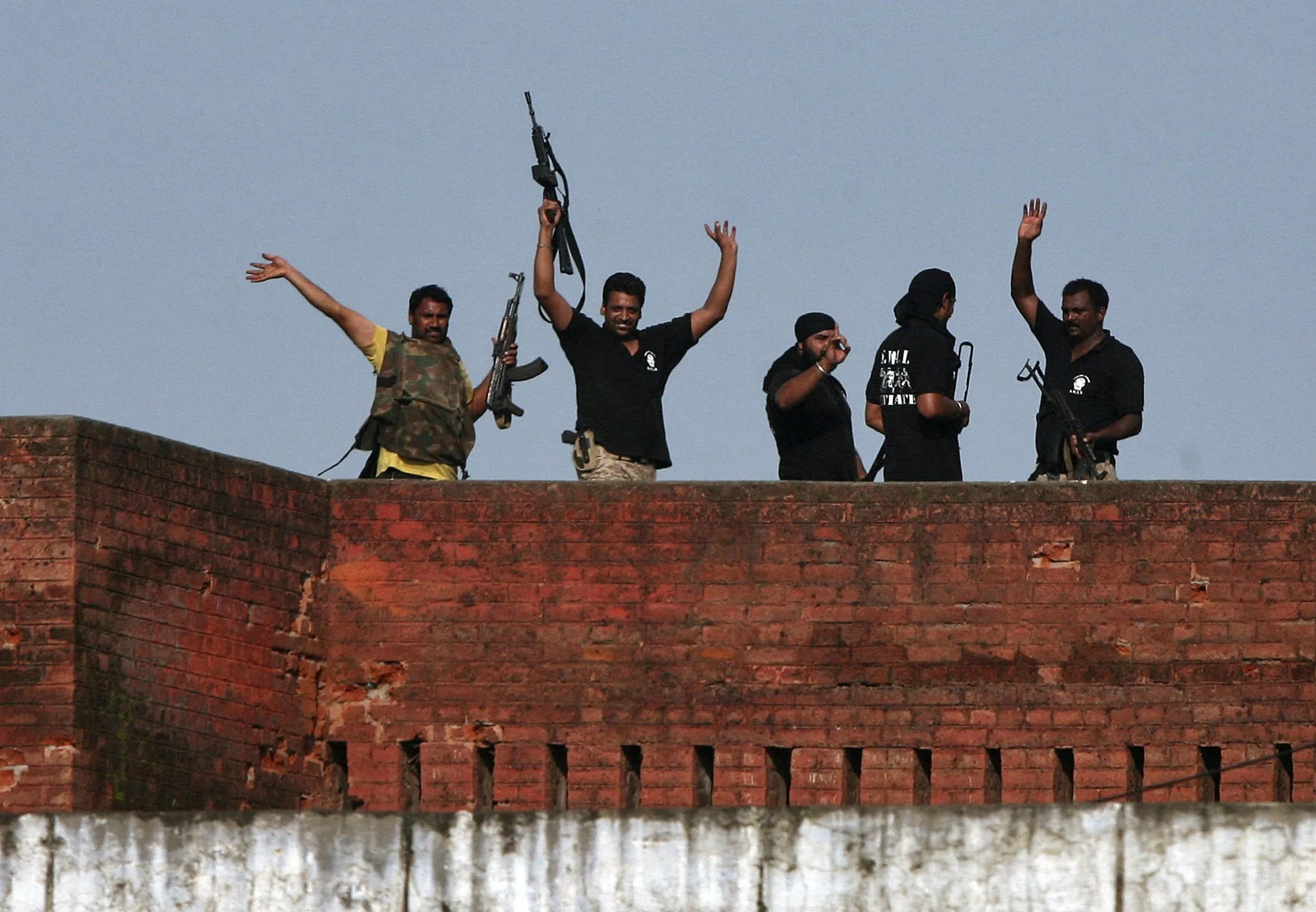 Indian security personnel celebrate on the roof of a police station after a gunfight in Dinanagar town, in Gurdaspur district of Punjab, India, July 27, 2015. Indian police overcame a group of gunmen dressed in military fatigues on Monday after a 12-hour battle that ended in the small-town police station near the border with Pakistan, and at least nine people were killed. (Photo by Munish Sharma/Reuters)