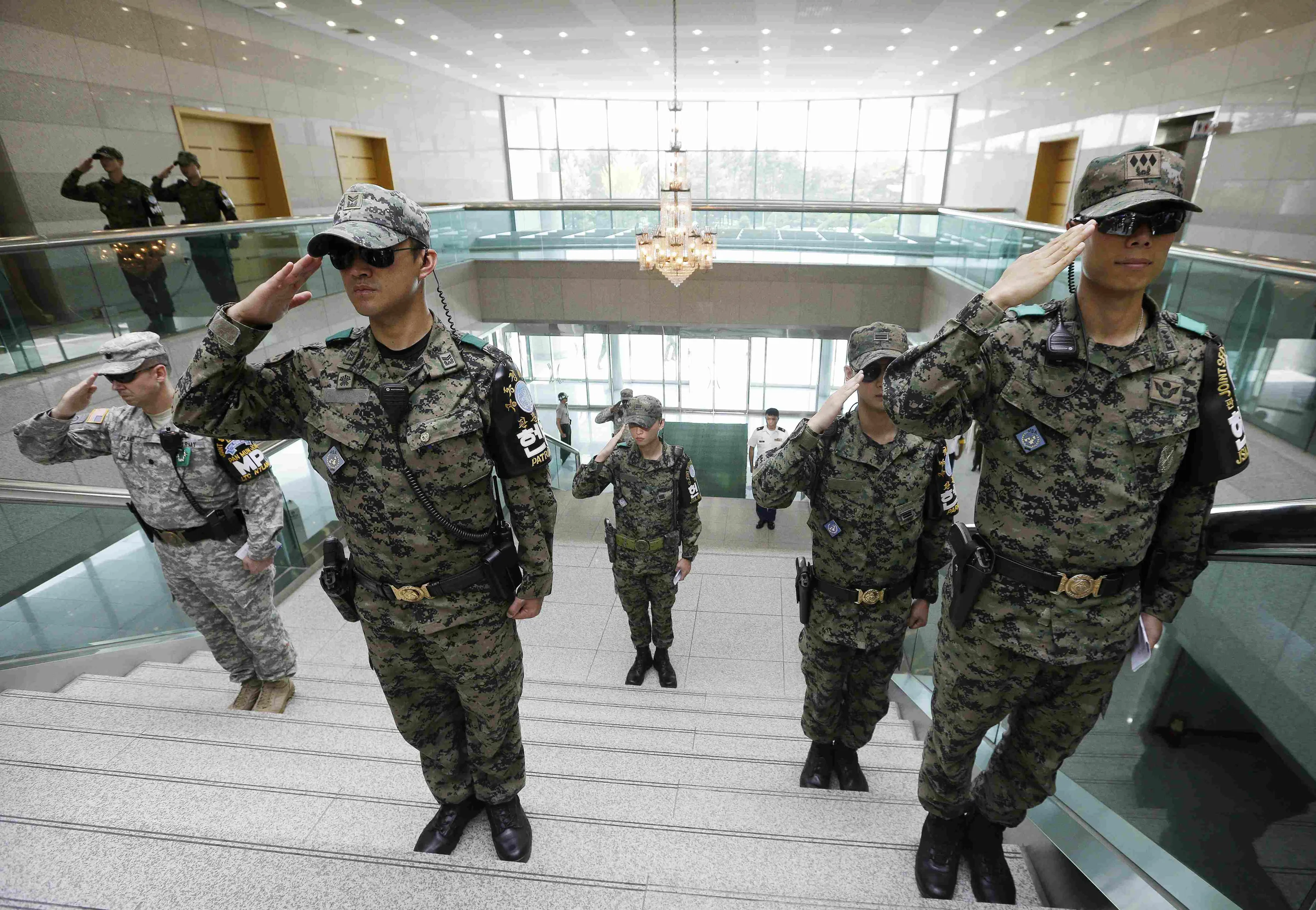 South Korean army soldiers salute during a ceremony to commemorate the 62nd anniversary of the Korean War Armistice Agreement that ended the Korean War at the border village of Panmunjom, which has separated the two Koreas since the Korean War in Paju, South Korea, July 27, 2015. (Photo by Ahn Young-joon/Reuters)
