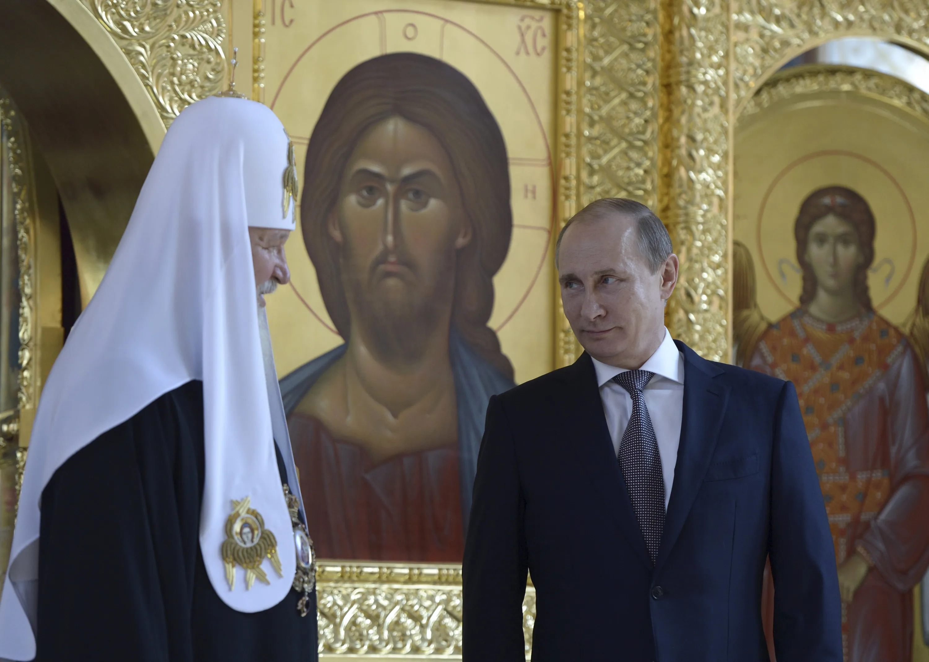 Russian President Vladimir Putin (R) listens to Patriarch of Moscow and All Russia Kirill at the recently renovated St. Prince Vladimir Cathedral during a celebration of 1000 year anniversary of the Great Prince Vladimir canonization in Moscow, Russia, July 27, 2015. (Photo by Alexei Nikolsky/Reuters/RIA Novosti/Kremlin)