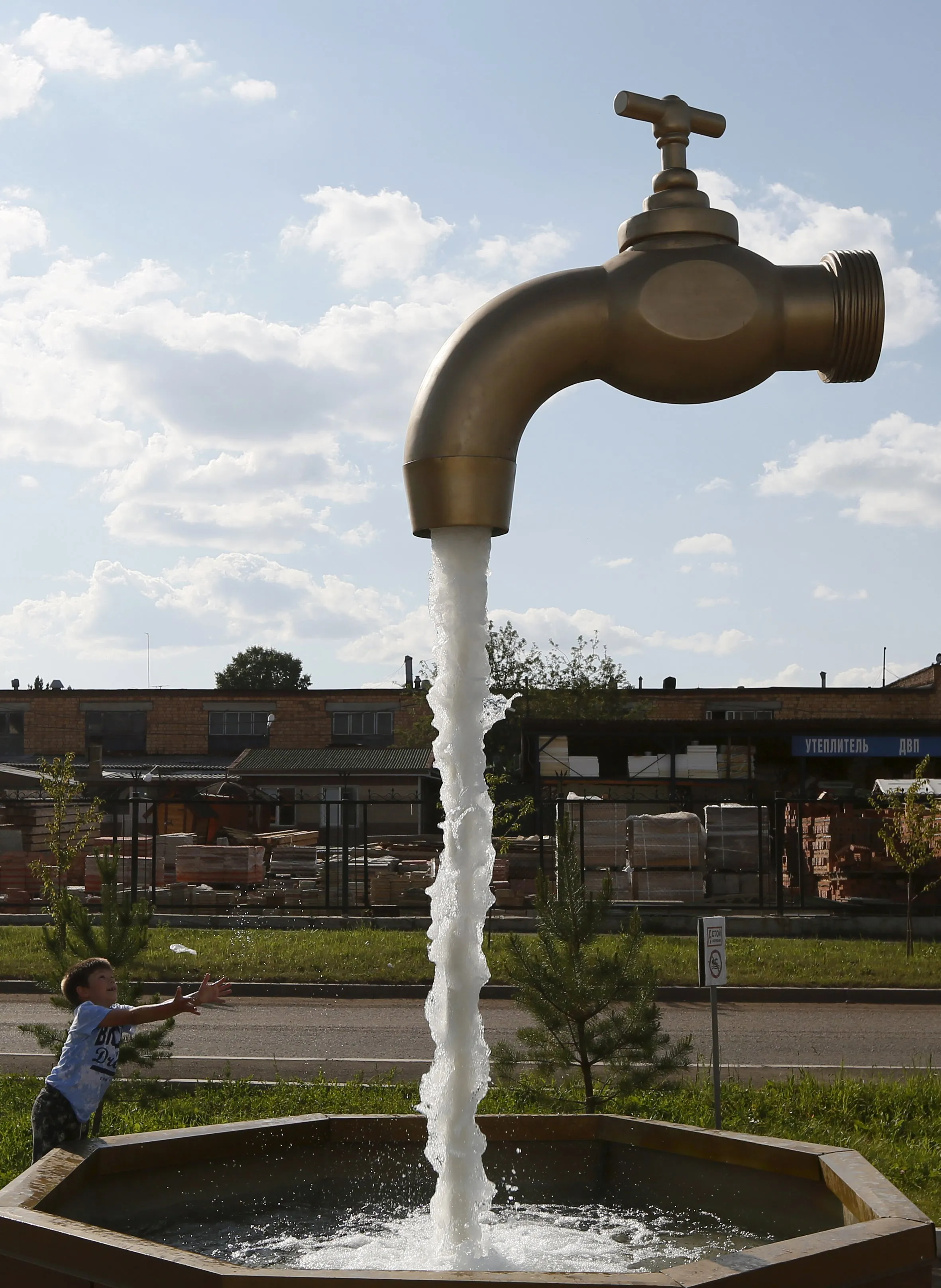 A boy plays near a fountain depicting a water tap in the Siberian city of Krasnoyarsk, Russia, July 27, 2015. (Photo by Ilya Naymushin/Reuters)