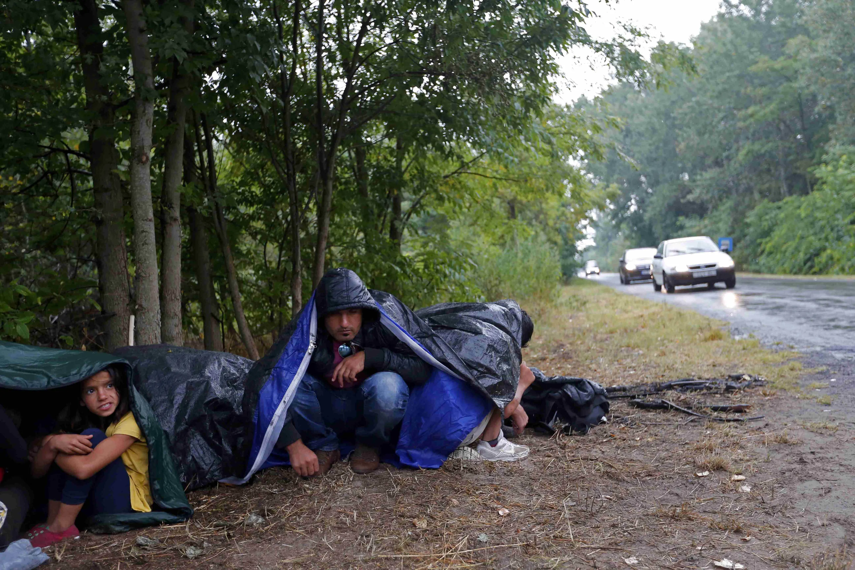 Migrants from Syria use sleeping bags to protect themselves from the rain as they rest on the side of a road after crossing the border illegally from Serbia, near Asotthalom, Hungary July 27, 2015. (Photo by Laszlo Balogh/Reuters)