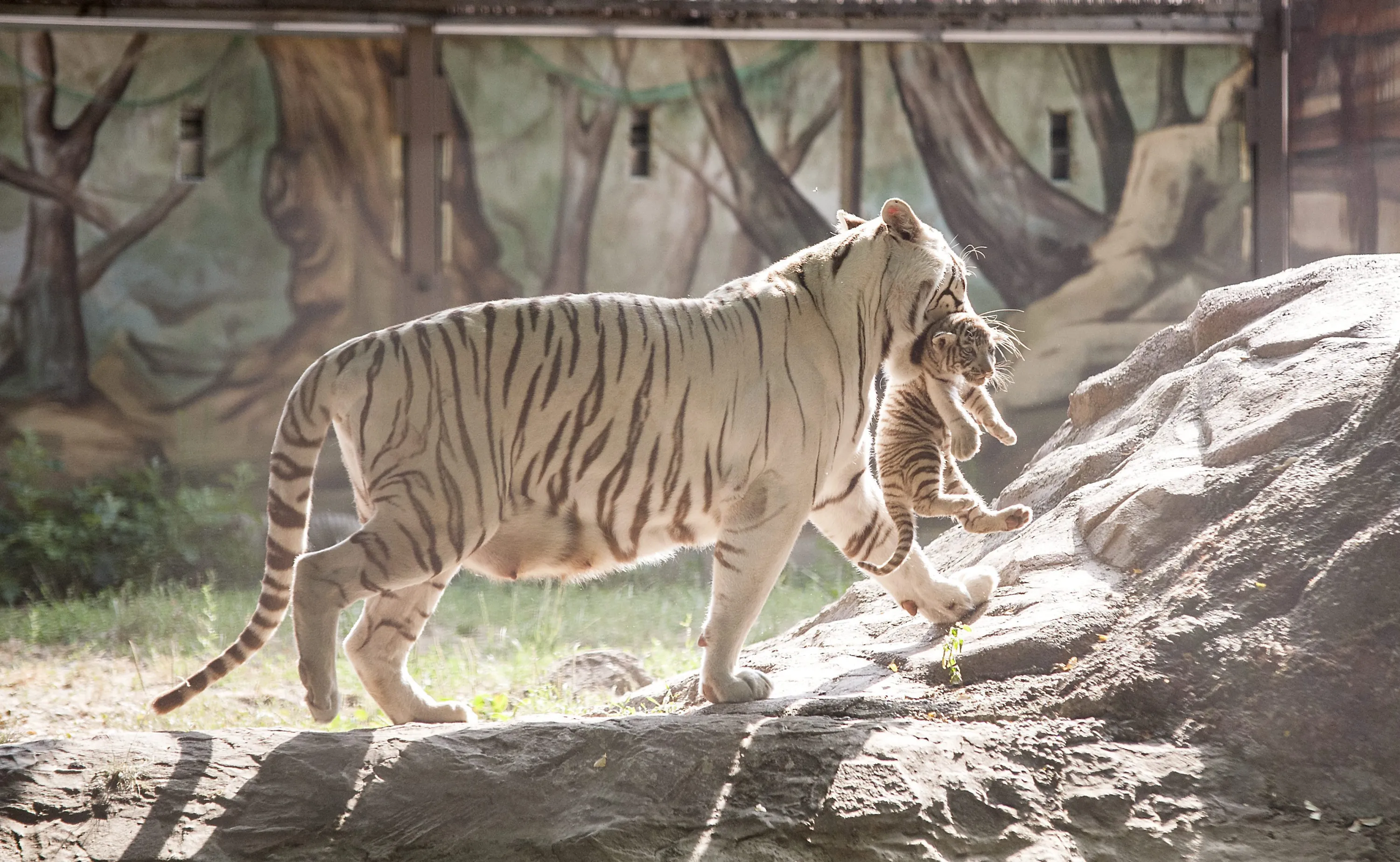 A white Bengali tigress carries one of her four cubs in their enclosure in Xantus Janos Zoo in Gyor, 120 kms west of Budapest, Hungary, Friday, July 24, 2015. The cubs were born late May. (Photo by Csaba Krizsan/MTI via AP Photo)