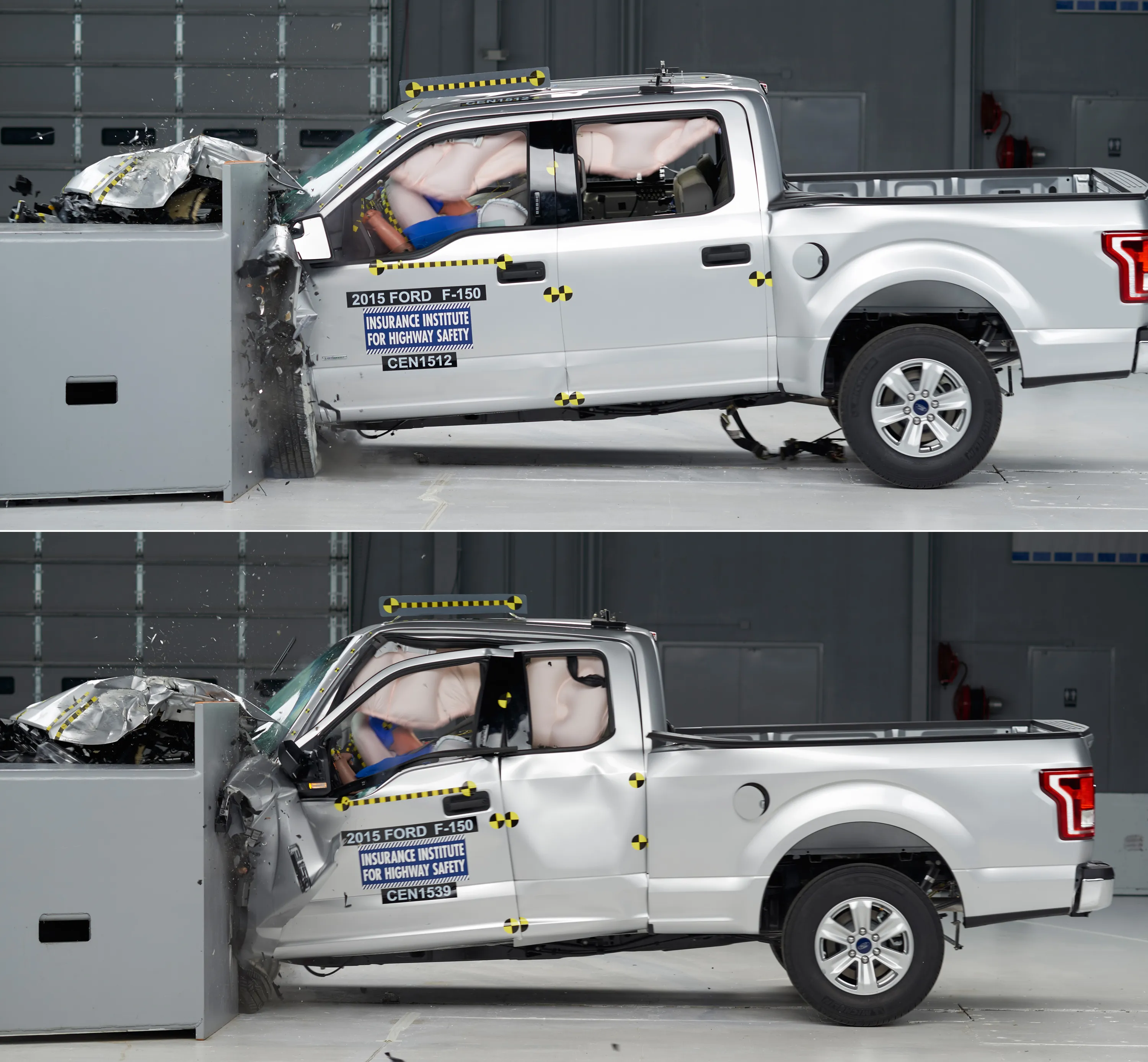 This combination made from 2015 photos provided by the Insurance Institute for Highway Safety (IIHS) shows crash tests of 2015 Ford F-150 Super Crew, top, and Super Cab pickup trucks. The four-door Super Crew got top ratings in all five of the crash tests. But the Super Cab version, which has a smaller rear door and back seat, did poorly in a small front overlap test, which slams 25 percent of the front of the truck into a barrier at 40 miles per hour. (Photo by Insurance Institute for Highway Safety via AP Photo)