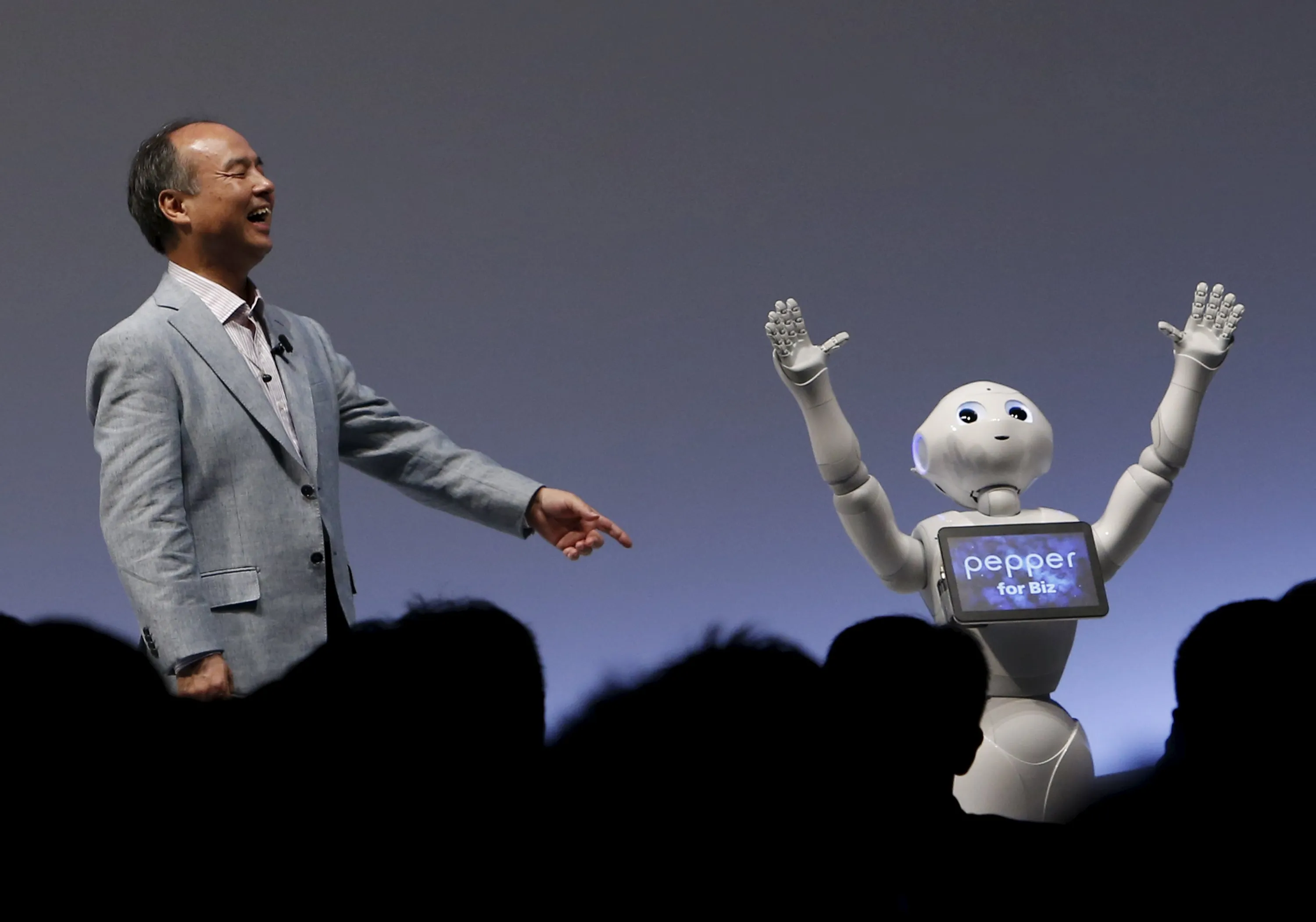 SoftBank Group Corp. Chairman and CEO Masayoshi Son reacts as SoftBank's human-like robots named “Pepper” performs during the SoftBank World 2015 event in Tokyo, Japan, July 30, 2015. (Photo by Yuya Shino/Reuters)