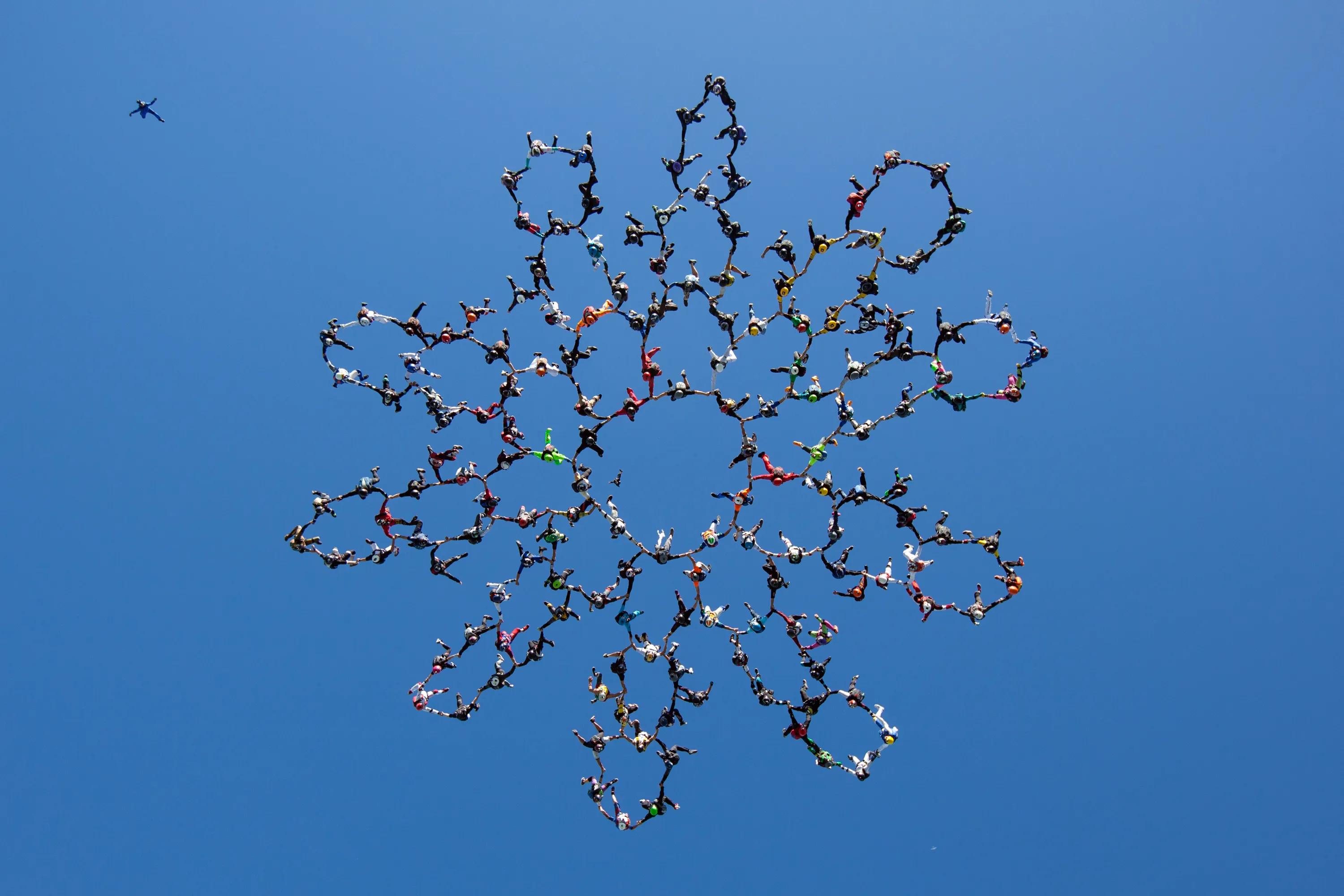 In this photo provided by Jason Peters, members of an international team of skydivers join hands, flying head-down to build their world record skydiving formation, Friday, July 31, 2015, over Ottawa, Ill. (Photo by Jason Peters via AP Photo)