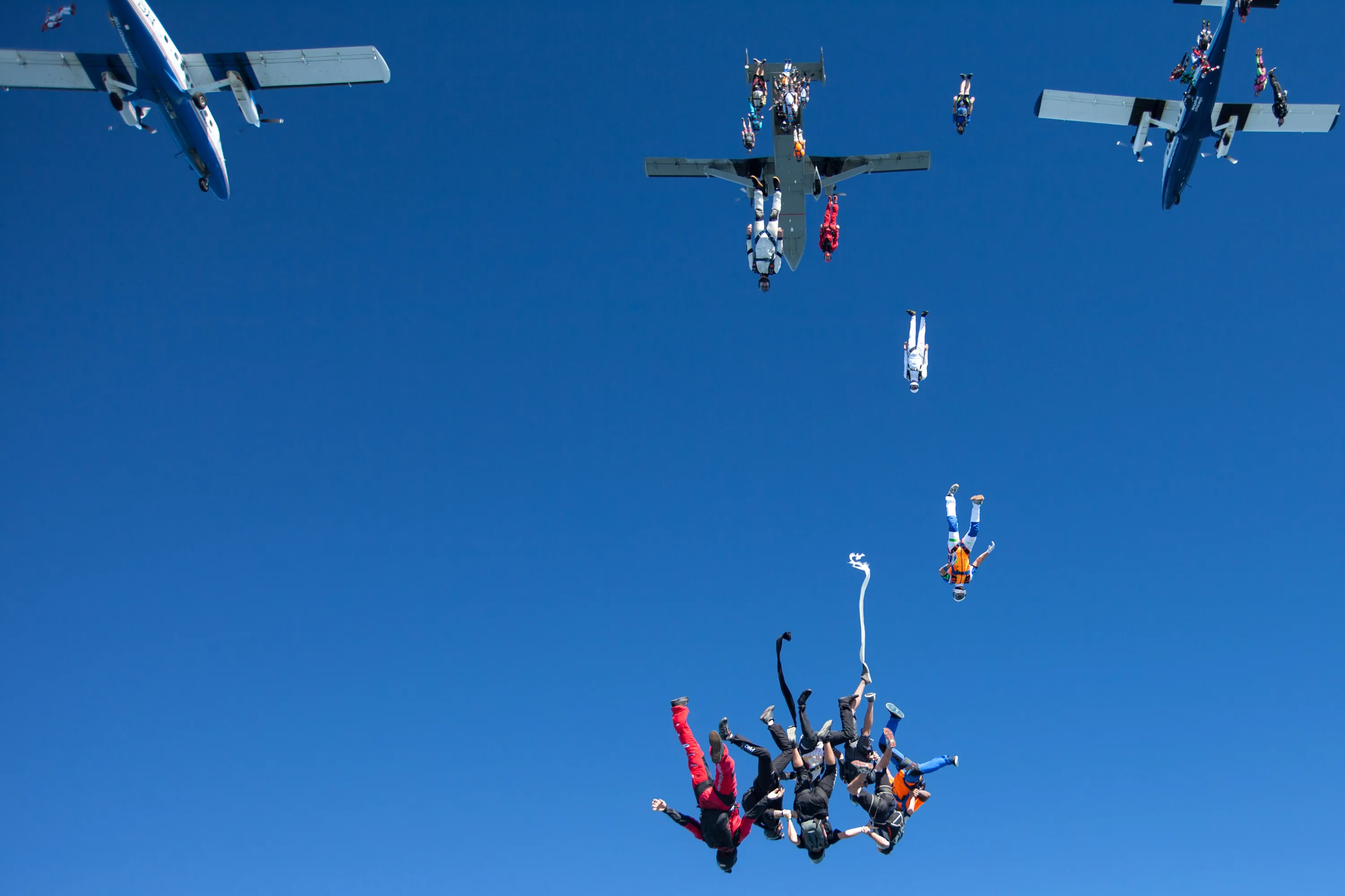 In this photo provided by Jason Peters, members of an international team of skydivers exit jump planes flying head-down on their way to building their world record skydiving formation Friday, July 31, 2014, over Ottawa, Ill. (Photo by Jason Peters via AP Photo)
