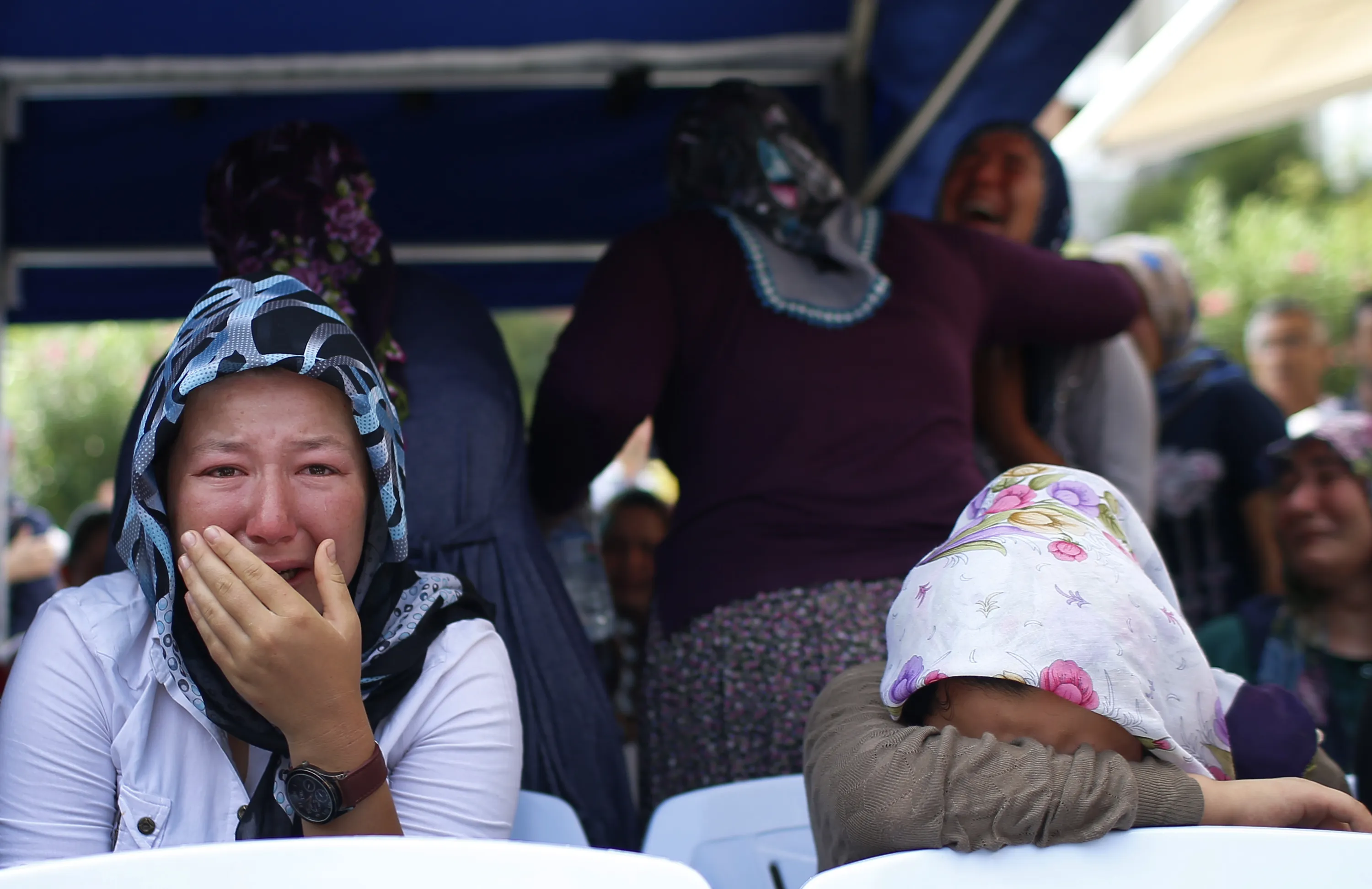 Relatives cry during the funeral of two police officers, killed in an attack by Kurdish rebels overnight, in the city of Adana, southern Turkey, Friday, July 31, 2015. Kurdish rebels have attacked a police station in southern Turkey, killing two policemen amid renewed violence between the security forces and the Kurdish insurgents. Two rebels were also killed in a gunfight that ensued. Violence has flared in Turkey in the past week, shattering a fragile peace process launched in 2012 with the Kurds. The government has launched aerial strikes against bases of the Kurdistan Workers' Party, or PKK, in northern Iraq and the rebels have escalated attacks against Turkey's security forces. Meanwhile, Turkey has also started to crack down on the Islamic State extremist group. (Photo by Emrah Gurel/AP Photo)
