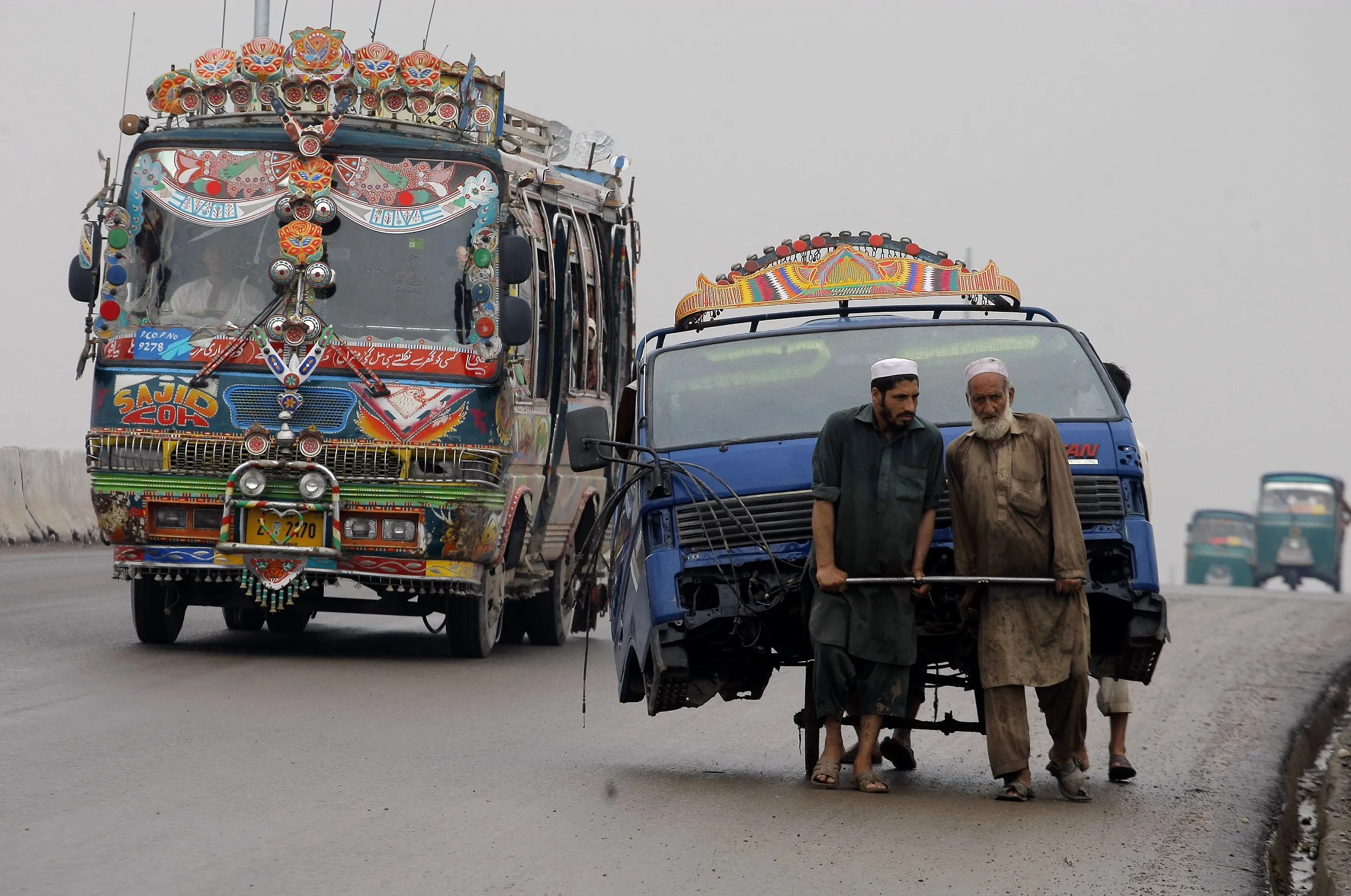 Pakistani laborers transport the front portion of a vehicle using a handcart at a road in Peshawar, Pakistan, Monday, August 3, 2015. (Photo by Mohammad Sajjad/AP Photo)