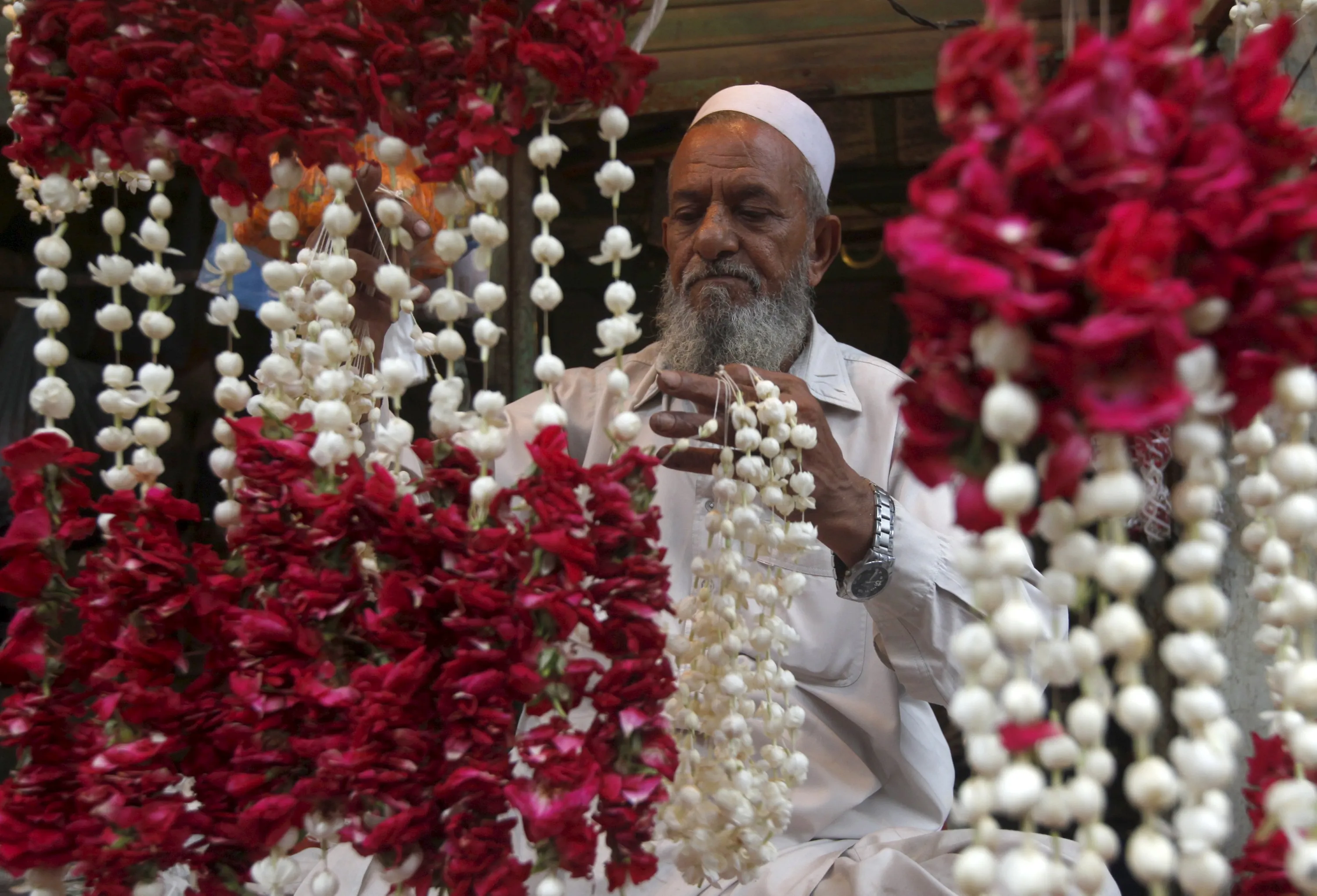 A man weaves jasmine flowers and roses to make garlands at a stall in Karachi, Pakistan, July 28, 2015. (Photo by Athar Hussain/Reuters)