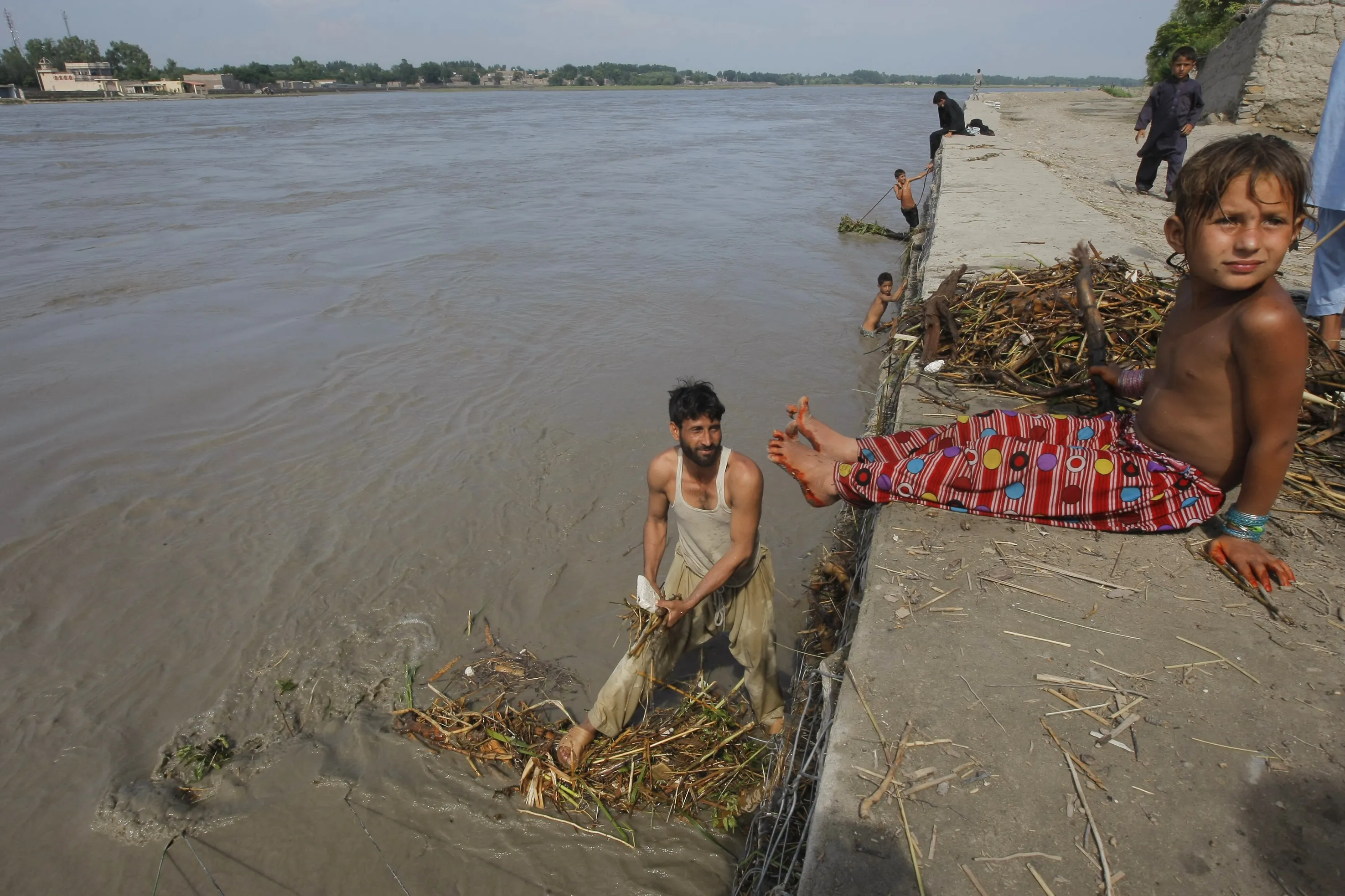 A man collects wood and straws to use as fuel for cooking from the flooded Kabul river near Peshawar, Pakistan, Wednesday, July 22, 2015. (Photo by Mohammad Sajjad/AP Photo)