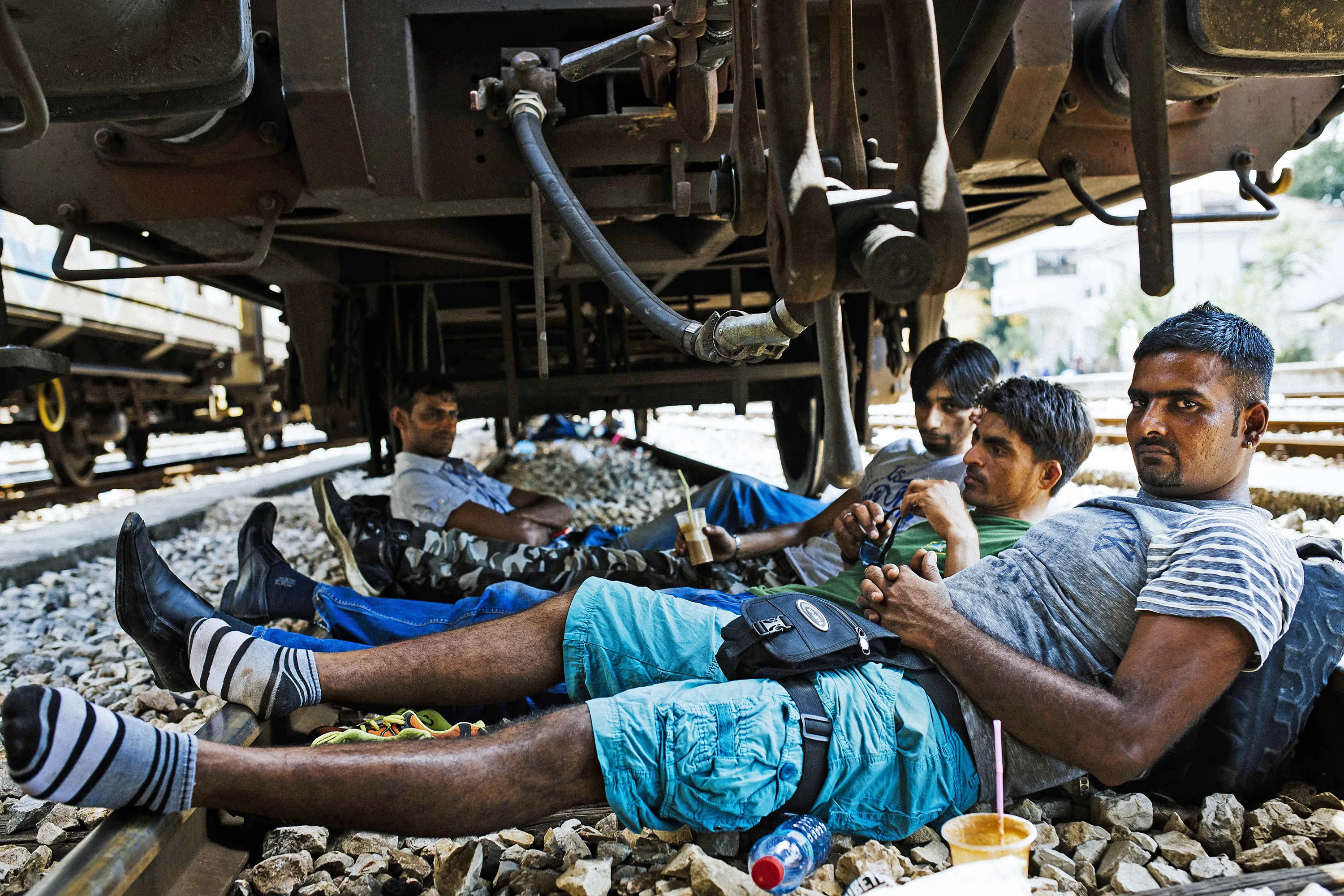 Pakistani migrants rest under a wagon on railway tracks at the train station in Gevgelija on the Macedonian-Greek border on August 5, 2015. (Photo by Dimitar Dilkoff/AFP Photo)