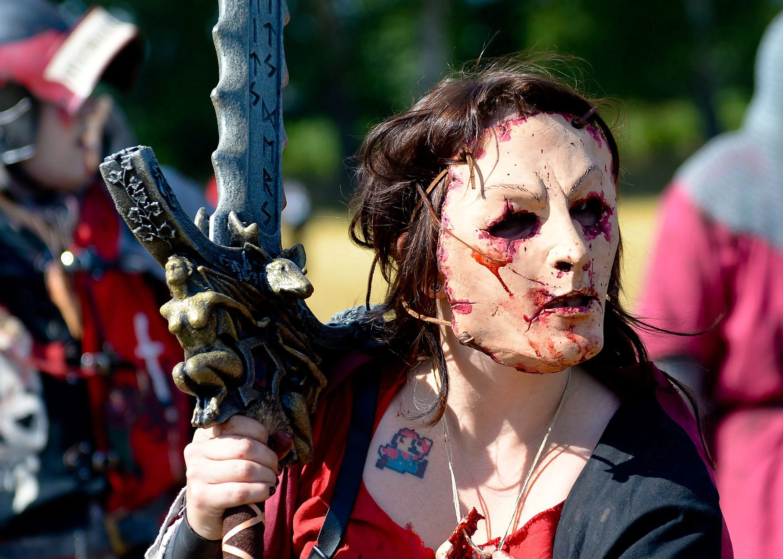 A participant in the “ConQuest of Mythodea” live action role-playing game stands on a fictional battlefield near Brokeloh, Germany, O6 August 2015. Around 800 participants from around the world are meeting for the 5-day games. (Photo by Eter Steffen/EPA)
