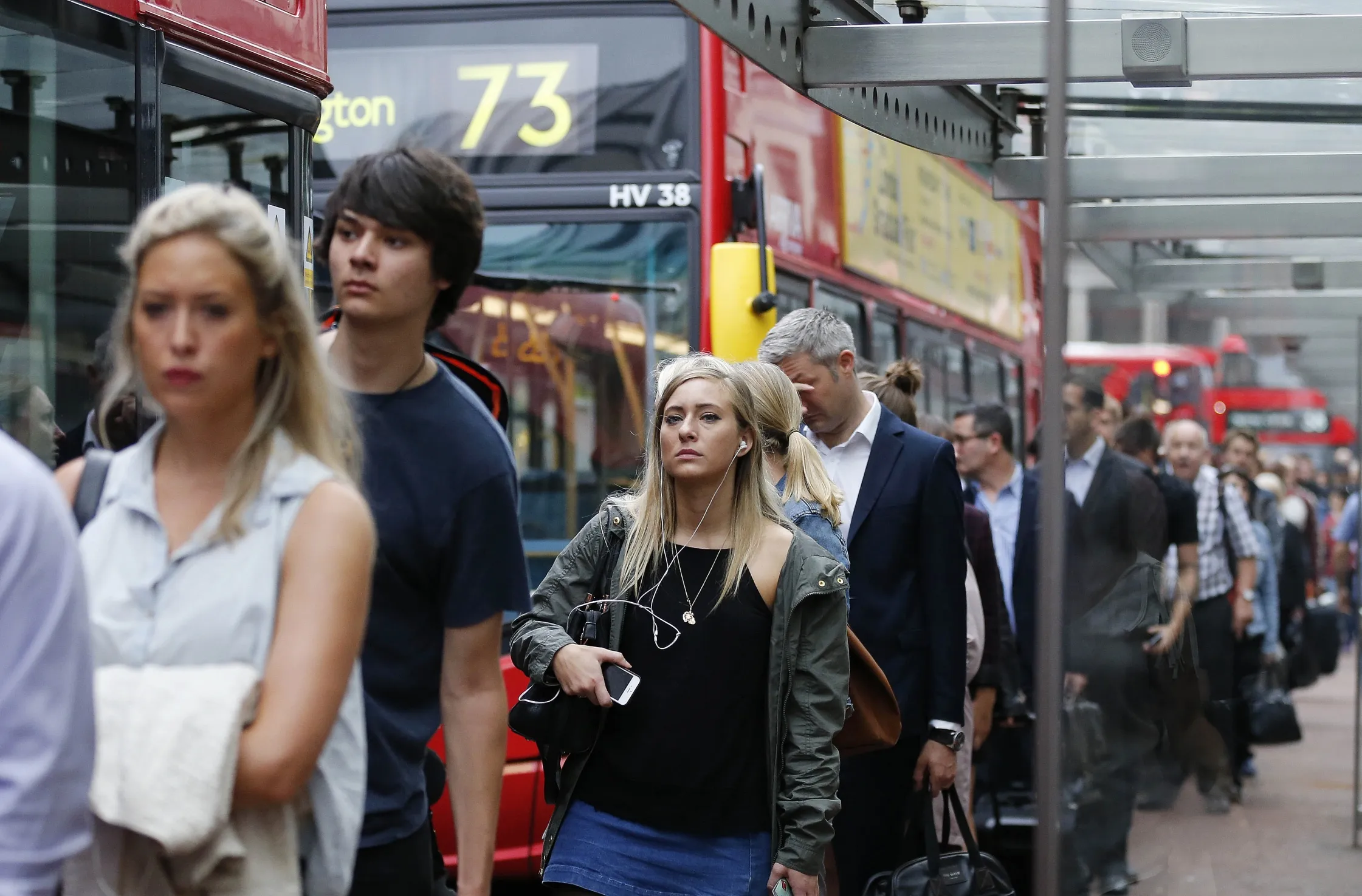 People queue up for bus transport at Victoria Station in London, Thursday, August 6, 2015. A 24-hour strike of London tube workers continues over pay and conditions surrounding the planned introduction of overnight tube services. The Underground handles 4 million journeys a day, and the strike by members of four unions will likely paralyze the capital's transport system, despite extra bus and river services. (Photo by Frank Augstein/AP Photo)