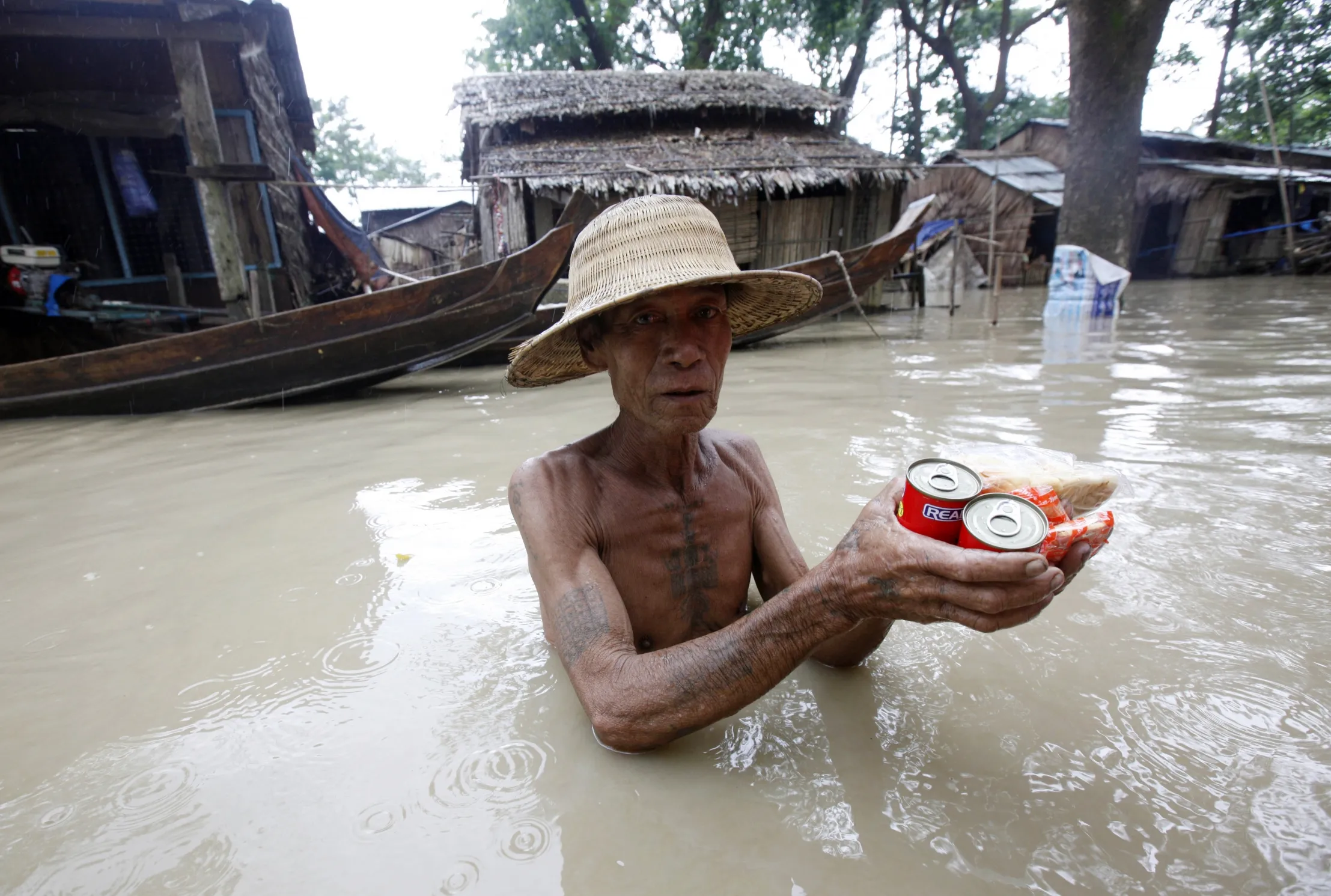 A man standing in floodwaters receives food in Nyaung Tone, in the Irrawaddy Delta, southwest of Yangon, Myanmar, Friday, August 7, 2015. Dozens have died from recent weeks of flooding and more than hundreds of thousands of people across 12 of the country's 14 states and regions have been affected, according to the U.N. Office for Coordination of Humanitarian Affairs. The floodwaters have been spreading from northern and central Myanmar to the populous Irrawaddy Delta, the country's rice bowl. (Photo by Khin Maung Win/AP Photo)