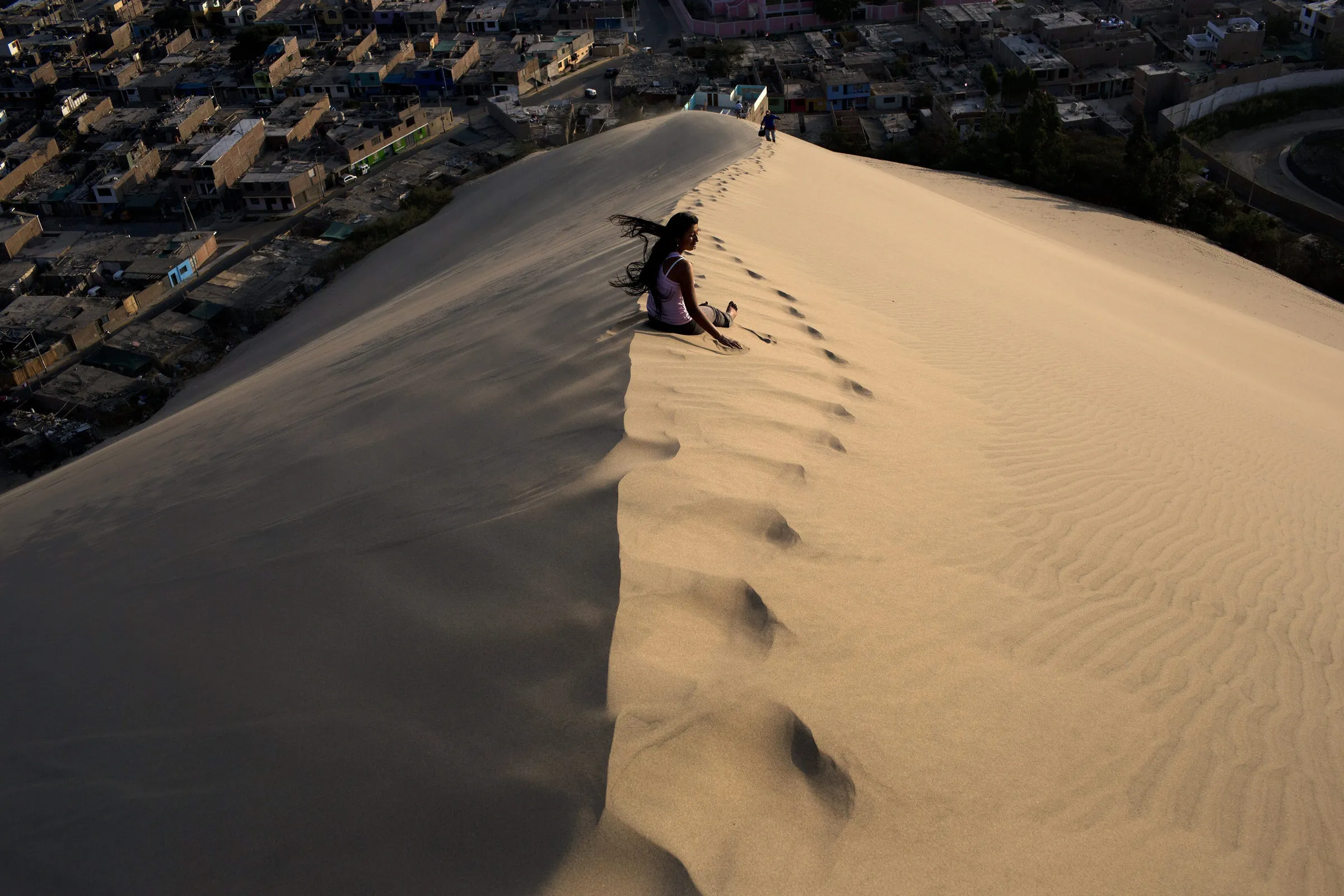 A woman waits for a friend while climbing the Cerro de Saraja, a mountain of sand, in Ica, Peru, Friday, August 7, 2015. (Photo by Rodrigo Abd/AP Photo)