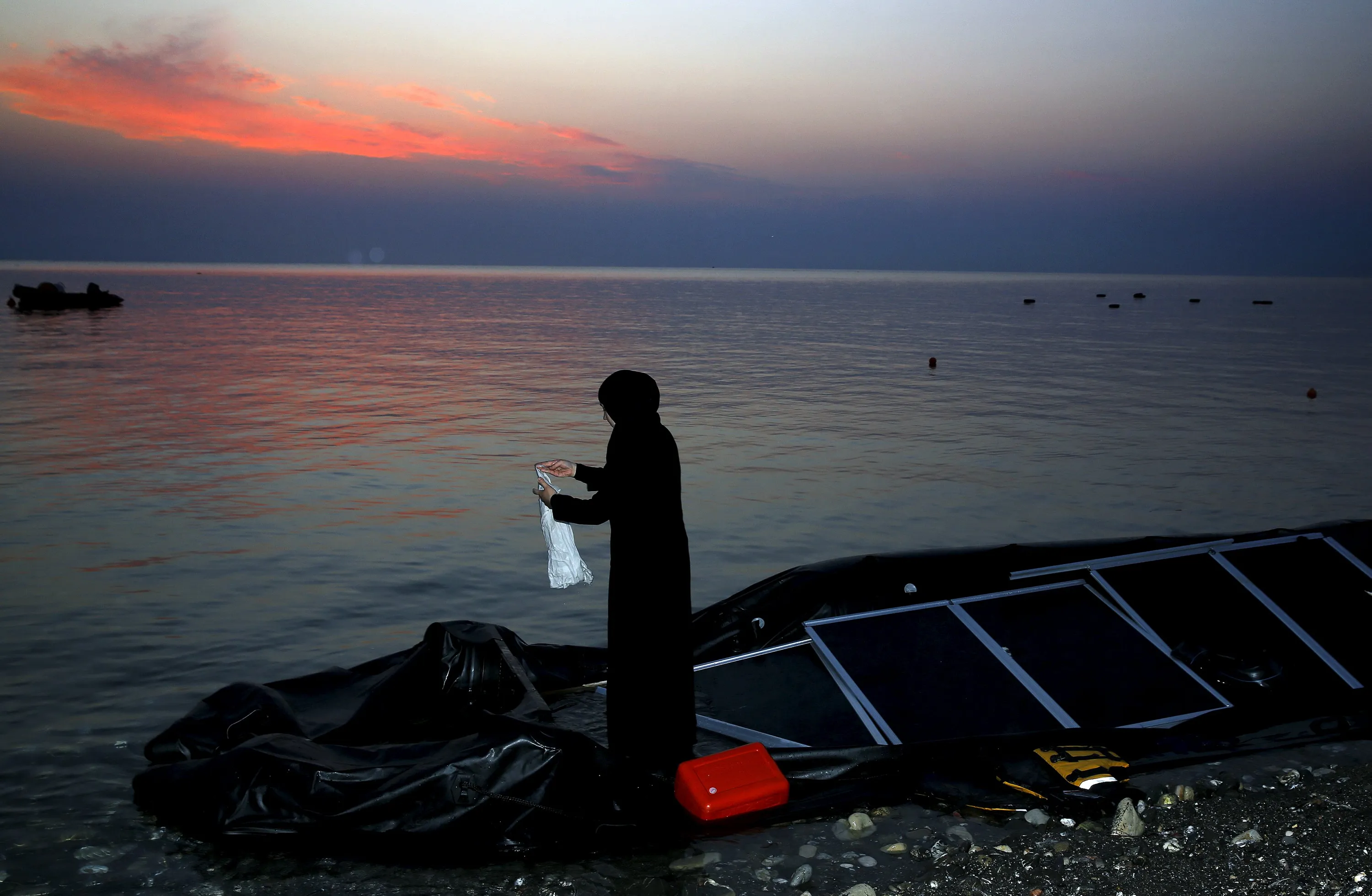 A Syrian refugee searches for her belongings around a deflated dinghy at a beach on the Greek island of Kos, after she and about 60 others crossed a part of the Aegean sea from Turkey, August 9, 2015. (Photo by Yannis Behrakis/Reuters)