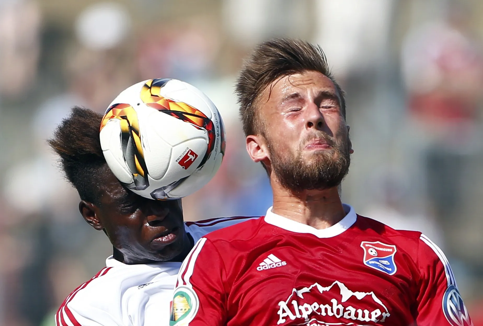 Danny Da Costa of FC Ingolstadt challenges Dominic Reisner of Unterhaching (R) during their German Cup (DFB Pokal) first round soccer match in Unterhaching, Germany August 9, 2015. (Photo by Michaela Rehle/Reuters)