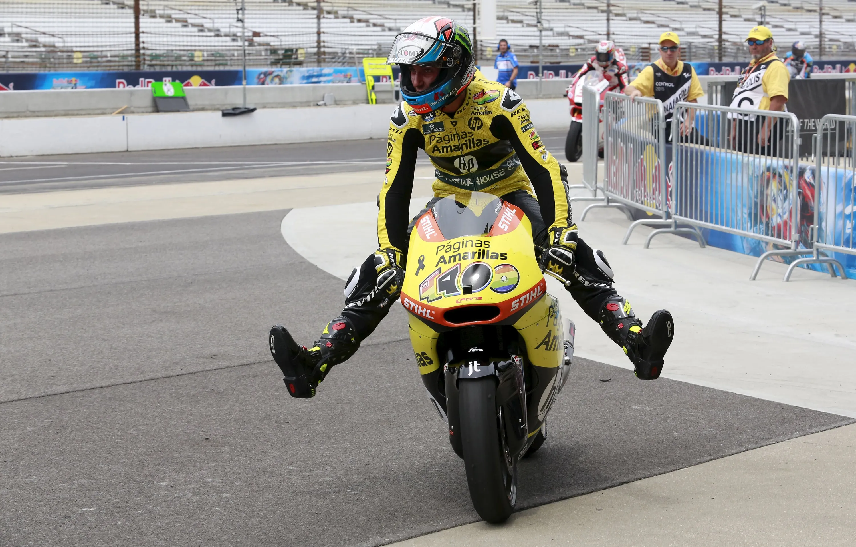 Kalex Moto2 rider Alex Rins of Spain raises his feet on his motorcycle as he rides in the pit lane after winning the Moto2 race at the Indianapolis GP in Indianapolis August 9, 2015. (Photo by Brent Smith/Reuters)