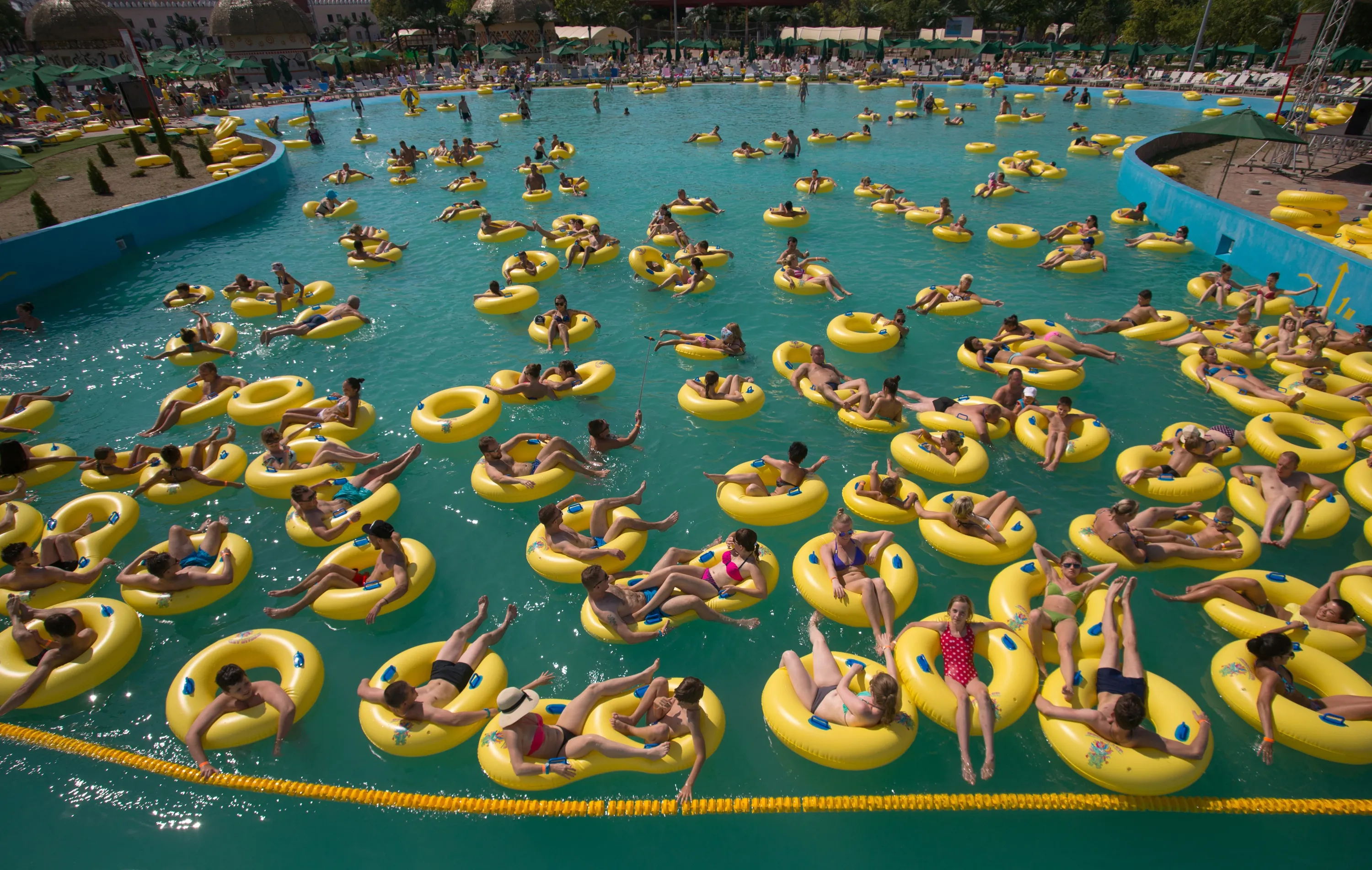 People cool off as they bathe at the aqua-park swimming pool in Minsk, Belarus, on Sunday, Aug. 9, 2015. Temperatures in the capital have reached around 32 degrees Celsius (89,6 F), drawing large crowds to the water park over the weekend. (Photo by Yauhen Leonov/AP Photo)