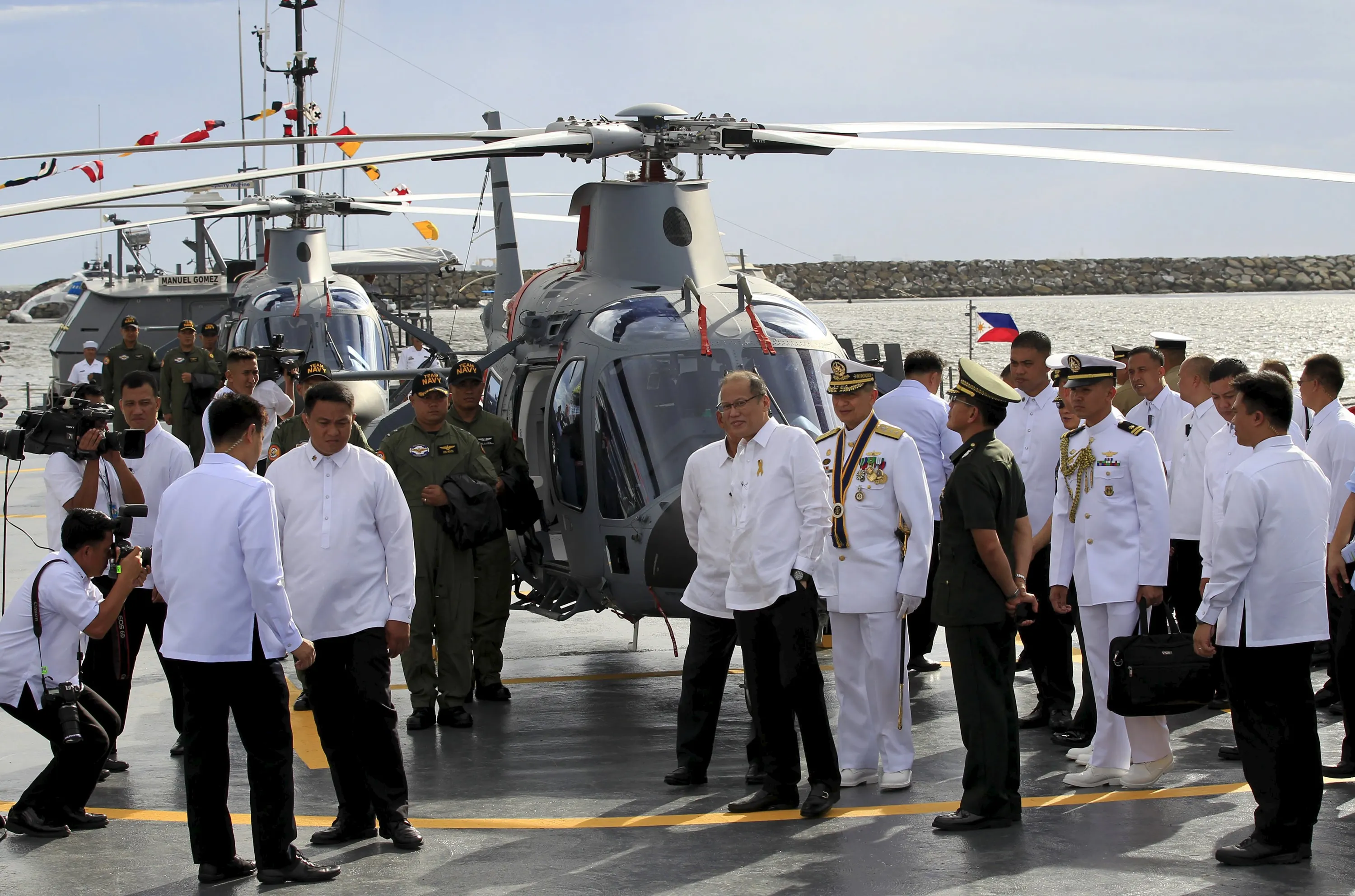 Philippine President Benigno Aquino (C) walks with Rear Admiral Caesar Taccad, new Flag-Officer-in-Command of the Philippine Navy, as they inspect one of the two newly-acquired AW109E multi-purpose helicopter during his visit at the navy headquarters in Manila August 10, 2015. (Photo by Romeo Ranoco/Reuters)