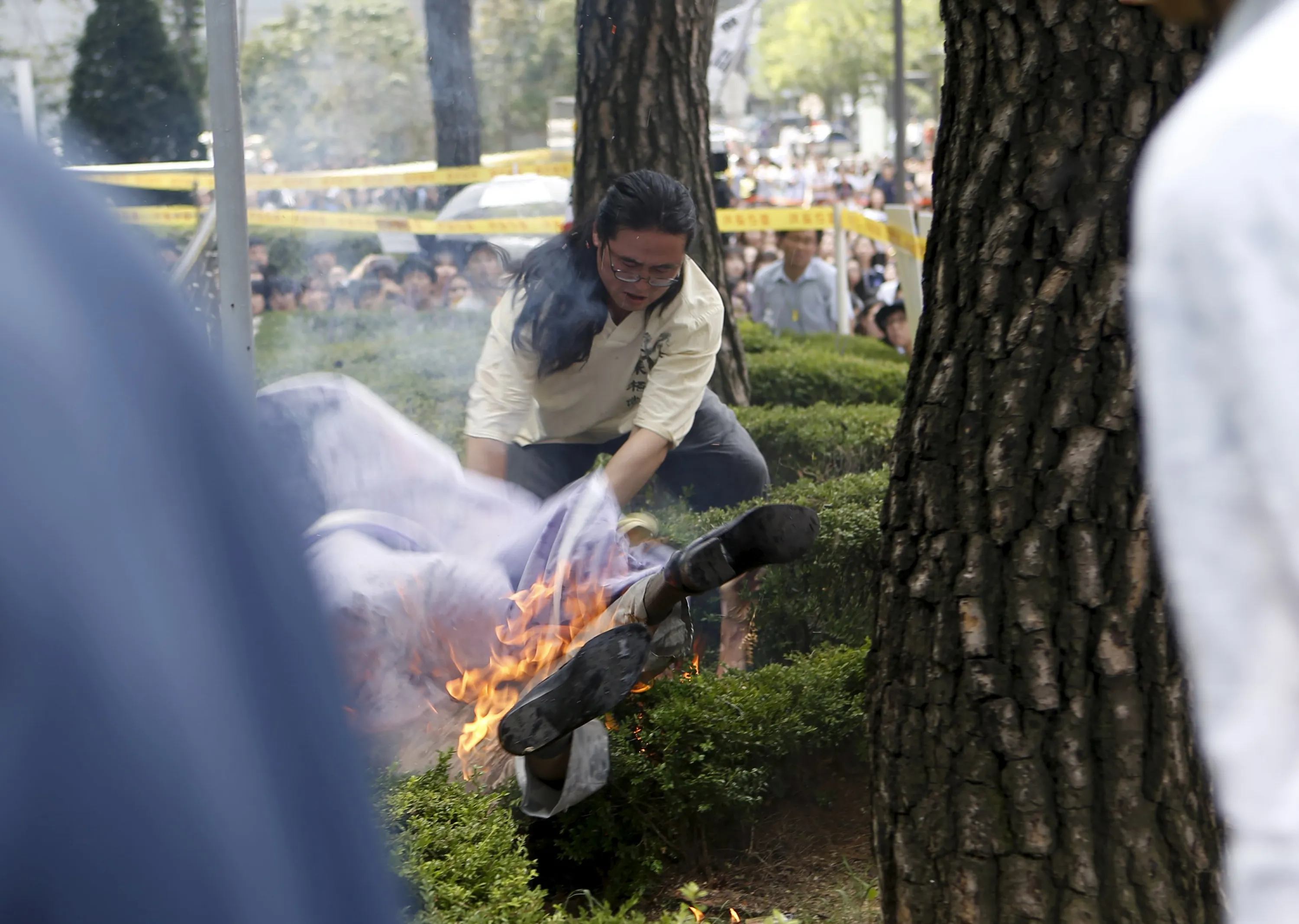A man attempts to put out flames from another man (bottom) who set himself on fire during a weekly anti-Japan rally to demand for an official apology and compensation from the Japanese government in front of the Japanese embassy in Seoul, South Korea, August 12, 2015. (Photo by Kim Hong-Ji/Reuters)