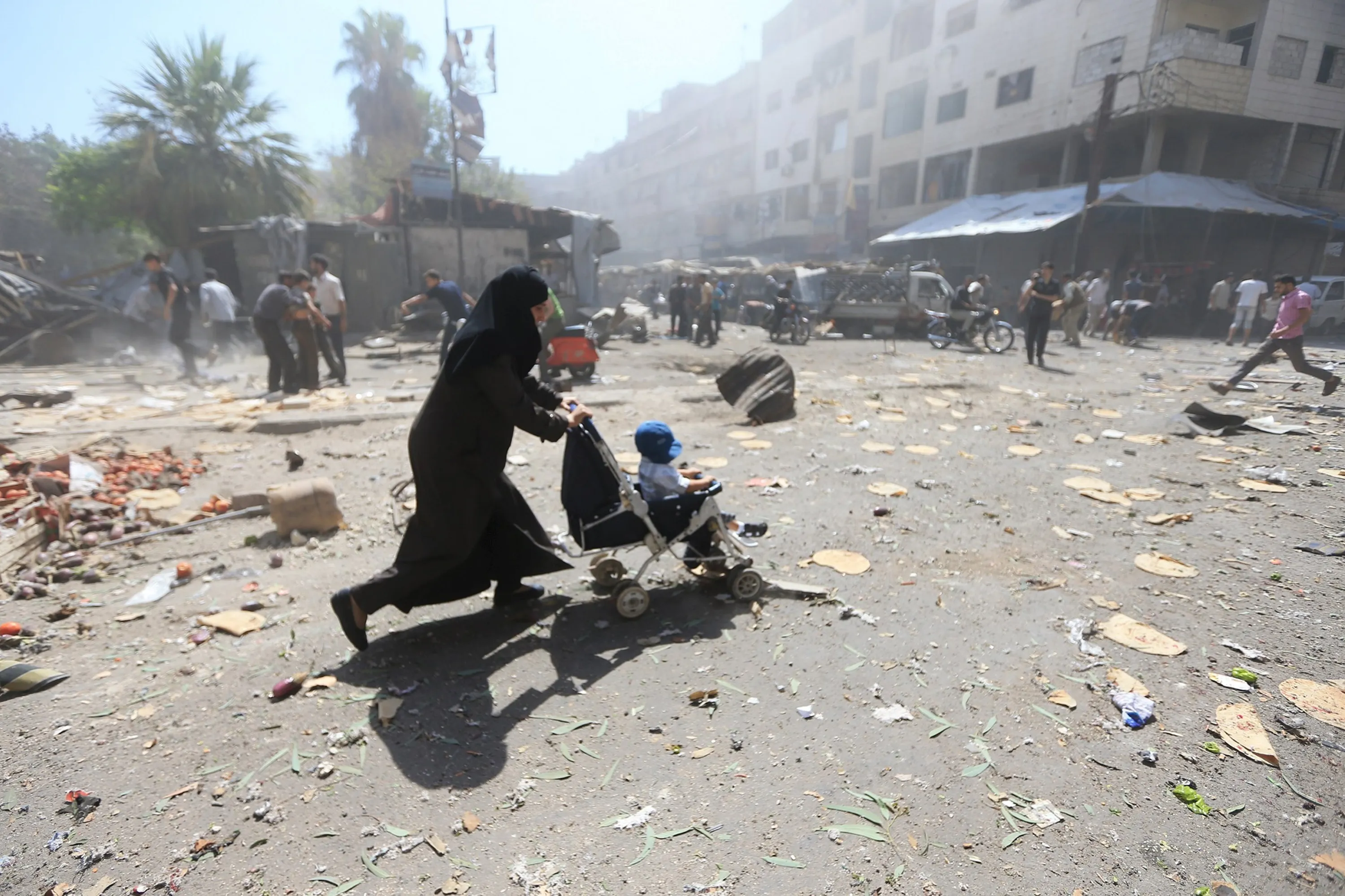 A woman pushes a baby stroller as she rushes away after what activists said were airstrikes by forces loyal to Syria's President Bashar al-Assad on a busy marketplace in the Douma neighborhood of Damascus, Syria August 12, 2015. (Photo by Bassam Khabieh/Reuters)