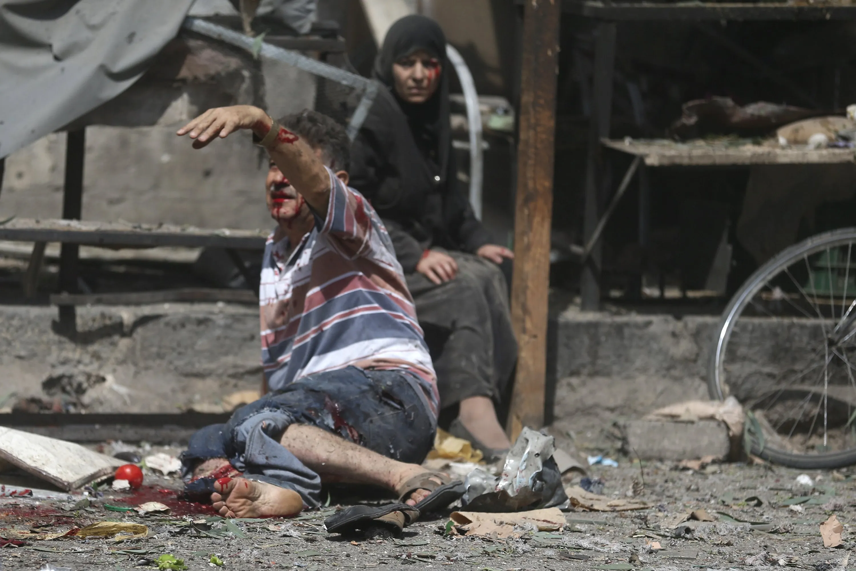 An injured man gestures as he sits near a wounded woman after what activists said were airstrikes by forces loyal to Syria's President Bashar al-Assad on a busy marketplace in the Douma neighborhood of Damascus, Syria August 12, 2015. (Photo by Bassam Khabieh/Reuters)