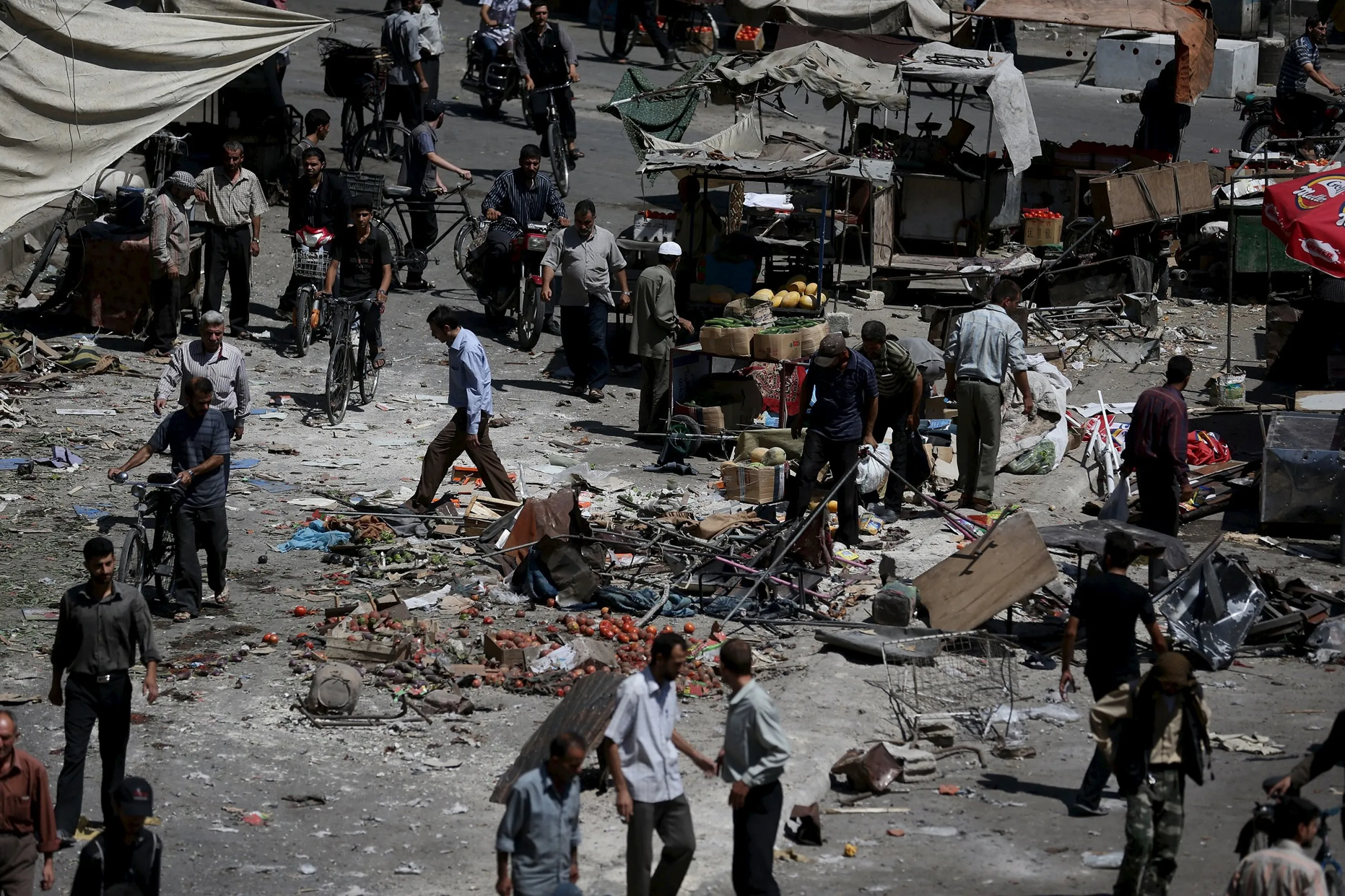 People inspect the damage after what activists said were airstrikes by forces loyal to Syria's President Bashar al-Assad on a busy marketplace in the Douma neighborhood of Damascus, Syria August 12, 2015. (Photo by Bassam Khabieh/Reuters)