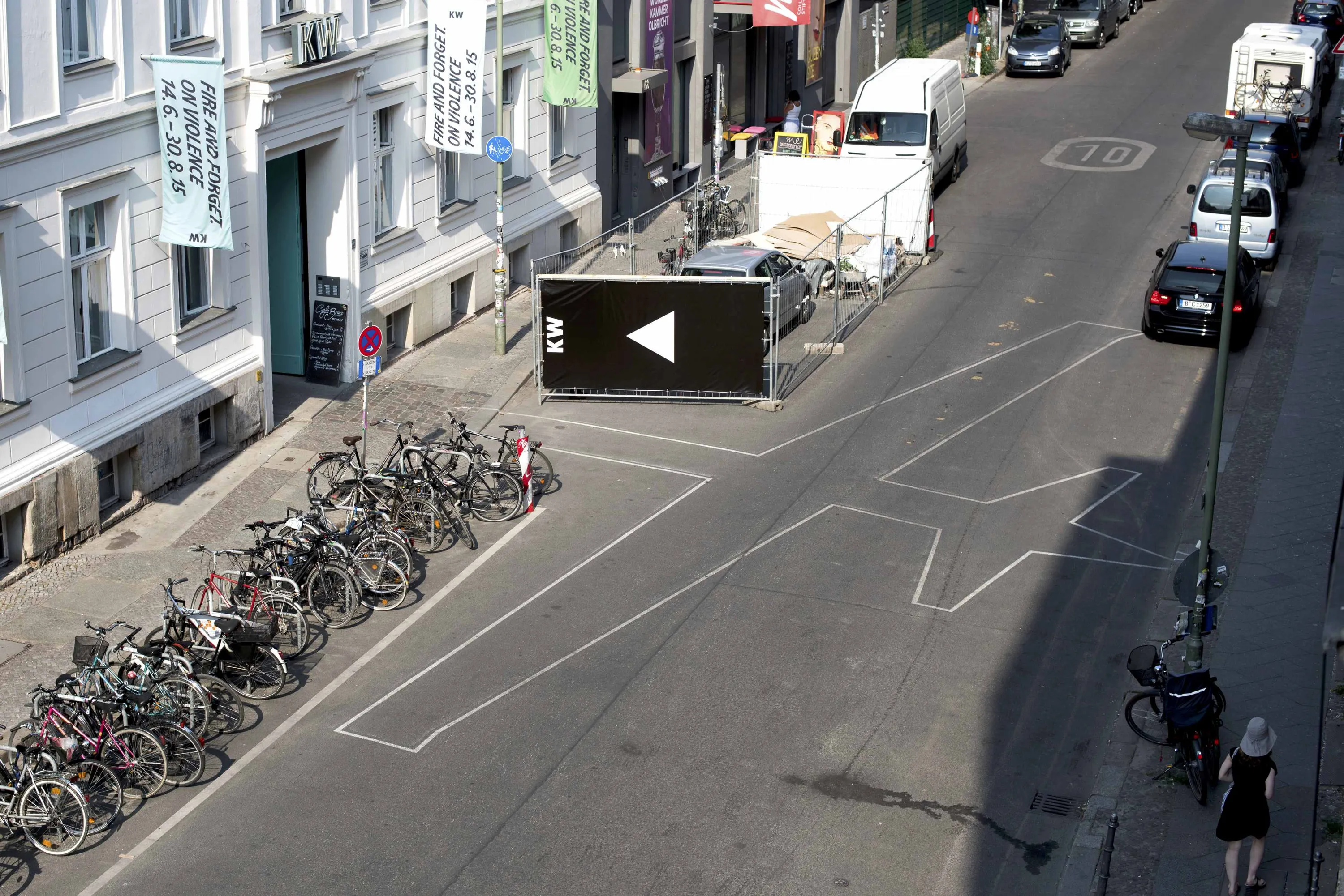 The artwork “Drone Shadow 008” by UK artist James Bridle is seen on the street in front of the KW gallery in Berlin, Germany August 11, 2015. British artist and anti-surveillance activist James Bridle is illuminating Germany with artwork exploring the darkest state secrets, cover-ups and information blackouts. (Photo by Stefanie Loos/Reuters)
