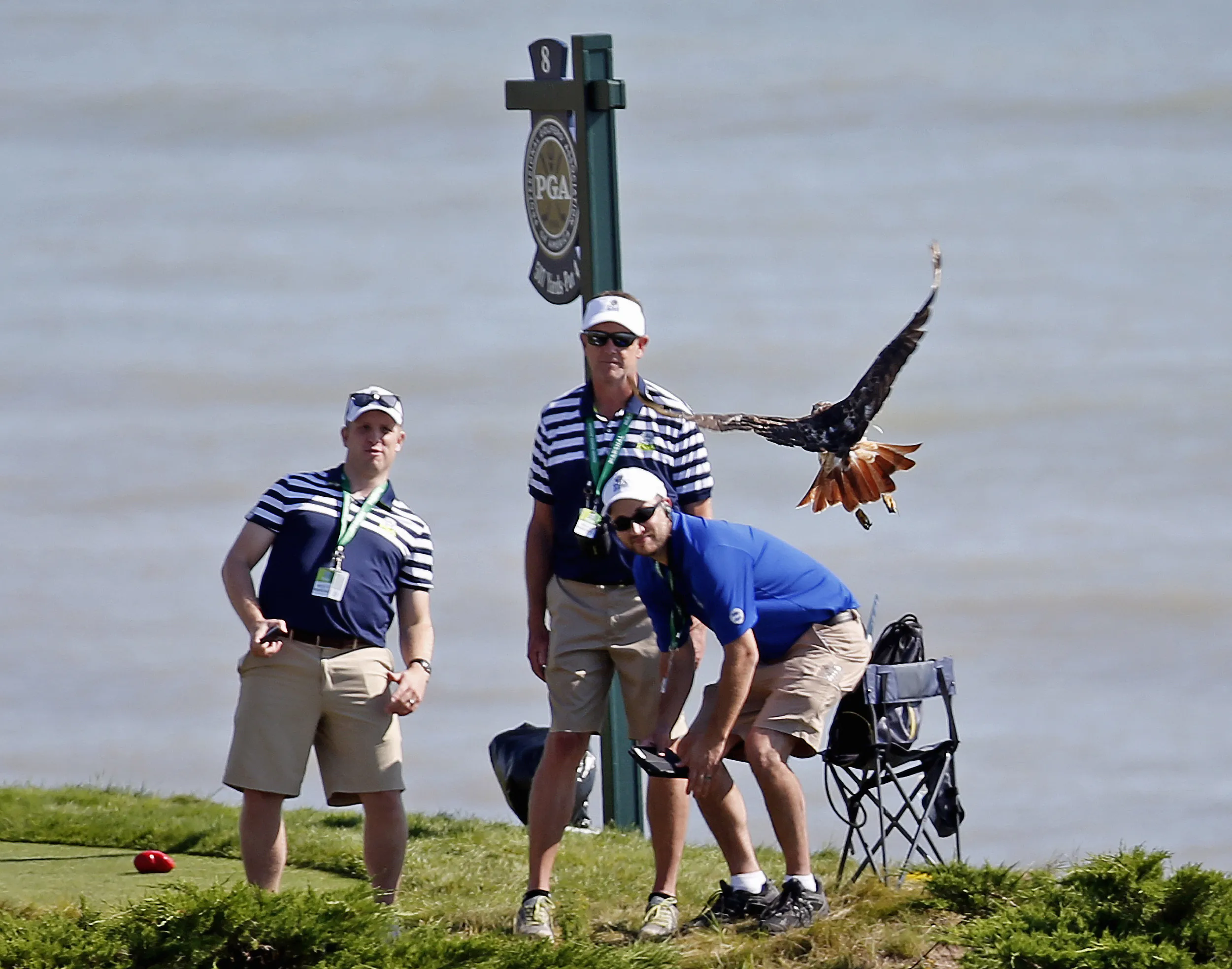 Marshals watch as a bird flies near the 8th tee during a practice round for the PGA Championship golf tournament Wednesday, August 12, 2015, at Whistling Straits in Haven, Wis. (Photo by Julio Cortez/AP Photo)