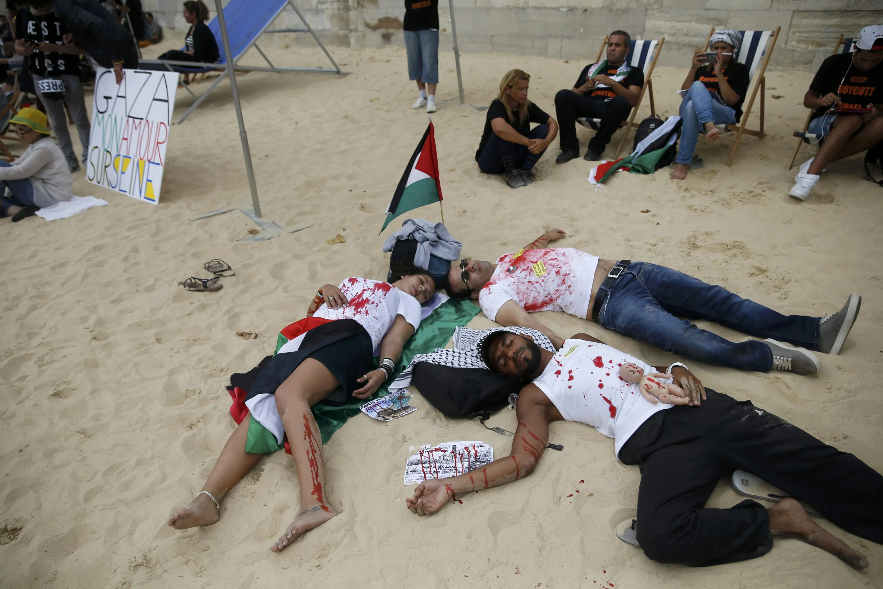 People covered in mock blood near a Palestinian flag and a placard which reads, “Gaza – My Love on Seine” stage their death on a artificial sand beach at “Paris Plages” to protest the “Tel Aviv on Seine” event, in Paris, France, August 13, 2015. (Photo by Pascal Rossignol/Reuters)