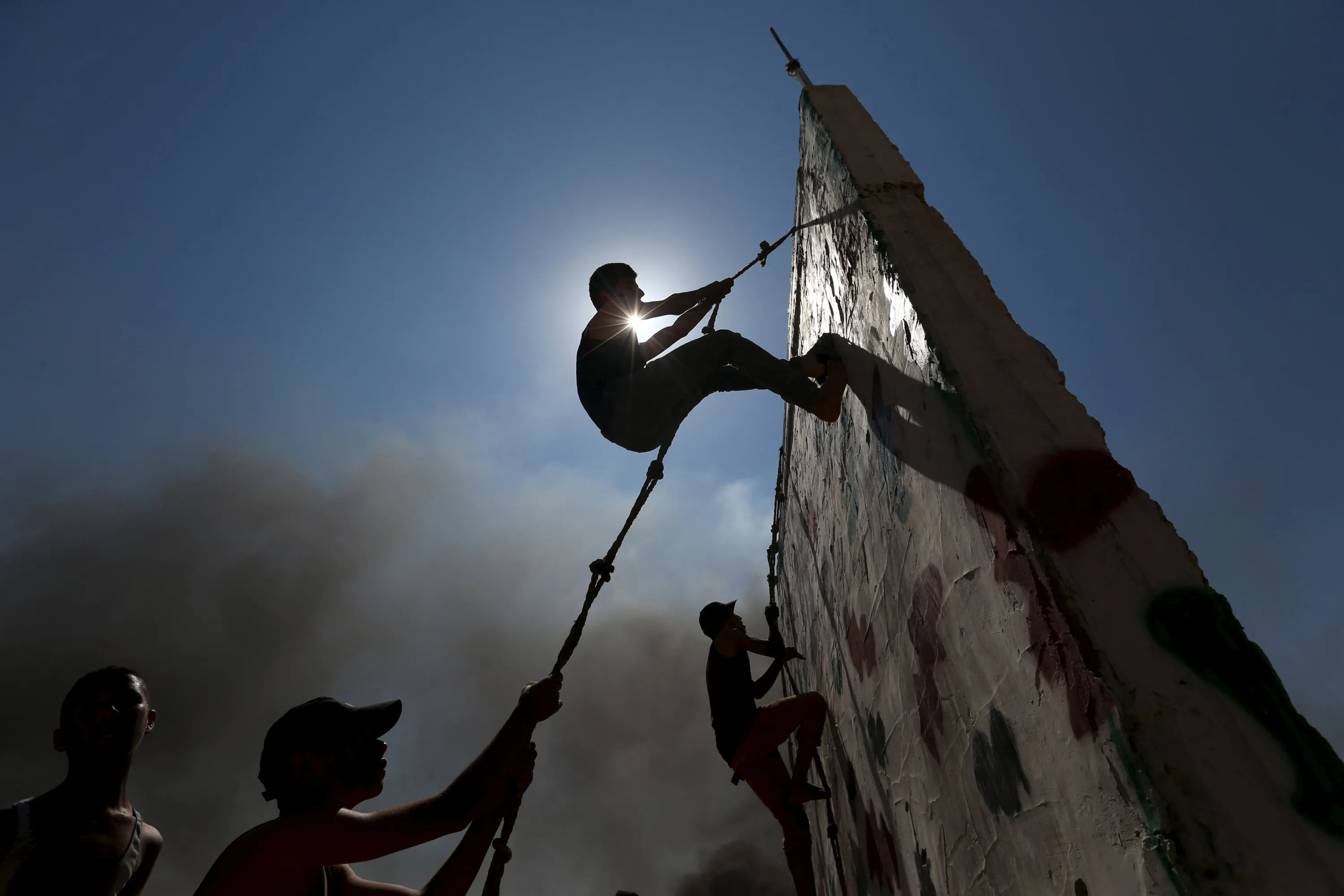 Young Palestinians climb a wall with a rope during a military-style exercise at a summer camp organized by Islamic Jihad movement, in Khan Younis in the southern Gaza Strip, August 13, 2015. (Photo by Ibraheem Abu Mustafa/Reuters)