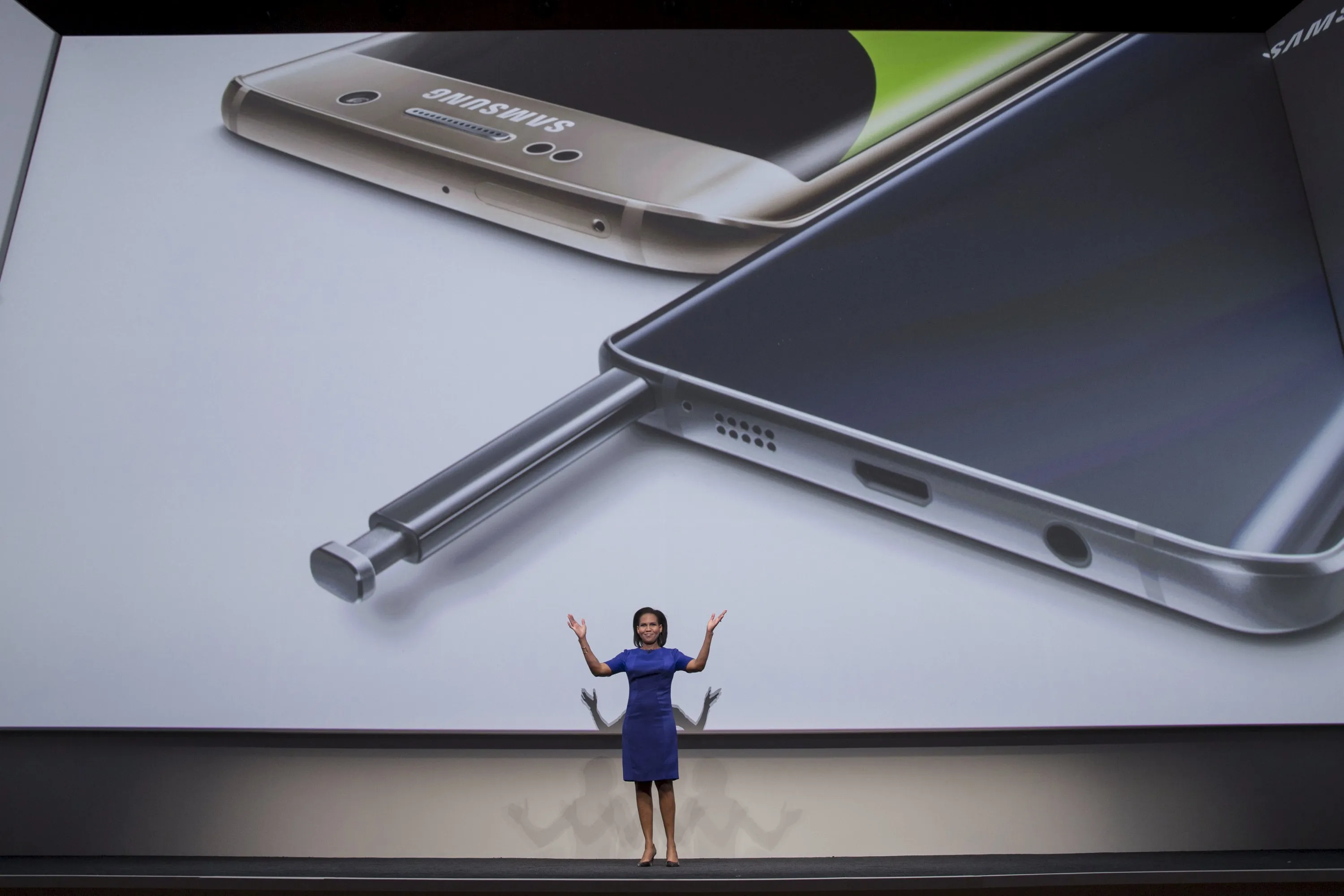 Vice President of Product Marketing for Samsung Electronics America, Alanna Cotton, speaks beneath images of a Samsung Galaxy S6 Edge+ and a Samsung Galaxy Note 5 at Samsung Galaxy Unpacked 2015 event in New York August 13, 2015. (Photo by Andrew Kelly/Reuters)